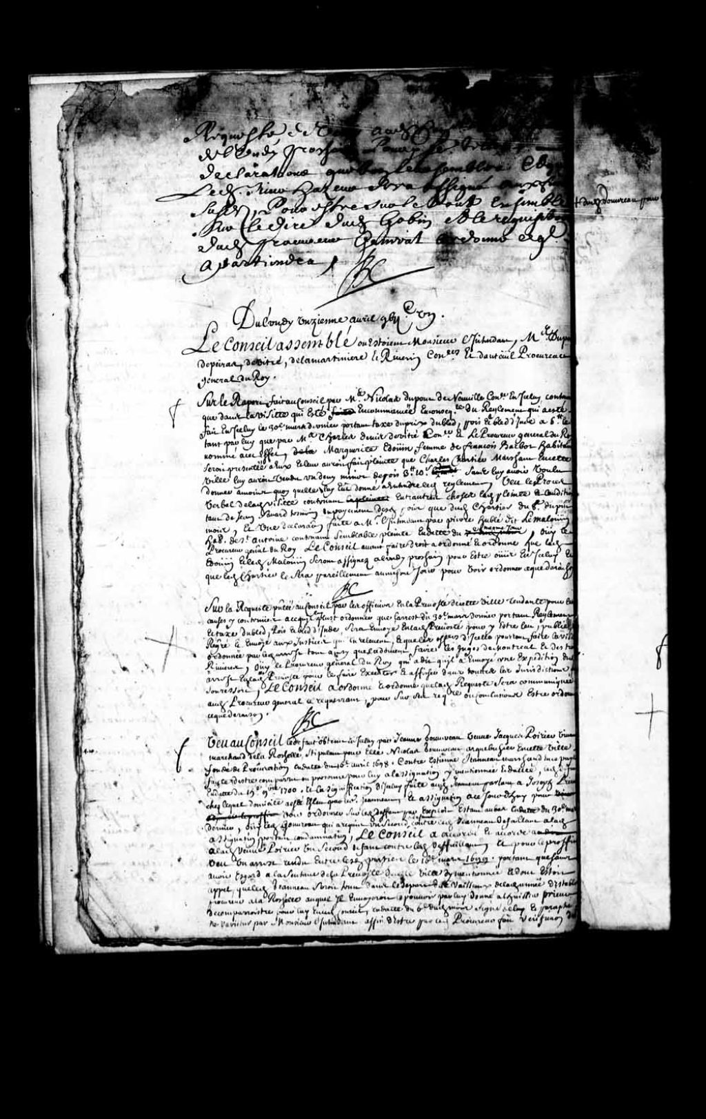 Transcription du texte avec orthographe modernisée : «Vu au Conseil le défaut obtenu en icelui par Jeanne Gouvereau (Gauvreau, Gauvereau) veuve Jacques Poirier vivant marchand de La Rochelle, stipulant pour elle Nicolas Gouvereau arquebusier en cette ville fondé de procuration en date du 16e avril 1698 contre Etienne Janneau (Janot) marchand en ce pays faute d'être comparu ou personne pour lui à l'assignation y mentionnée et datée, ledit défaut en date du 15e novembre 1700. Et la signification d'icelui faite audit Janneau parlant à Joseph Prieur chez lequel domicile a été élu par ledit Janneau et assignation à ce jourd'hui pour voir ordonner sur ledit défaut par l'exploit étant au bas en date du 30e mars dernier, ouï ledit Gouvereau qui a requis un second défaut contre ledit Janneau défaillant à ladite assignation portant condamnation. Le Conseil a accordé et accorde à ladite veuve Poirier un second défaut contre ledit défaillant, et [...]