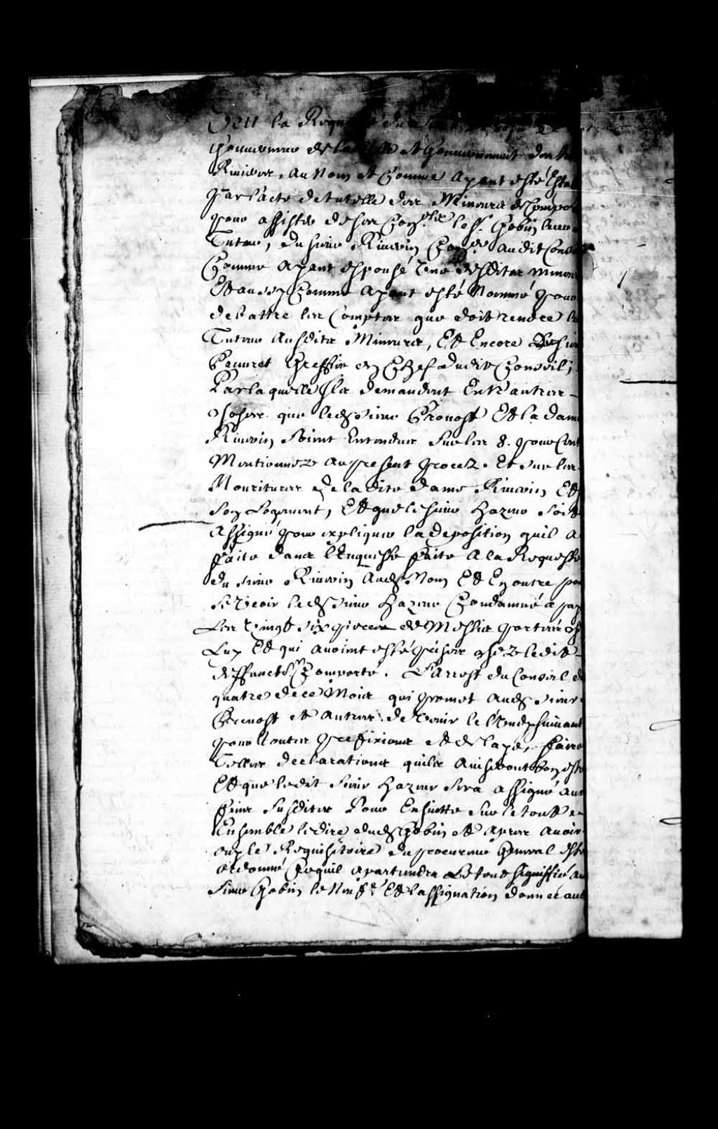 - Transcription du texte avec orthographe modernisée : «Vu la requête du sieur Provost gouverneur de la ville et dépendances des Trois-Rivières au nom et comme ayant été établi par l'acte de tutelle des mineurs de Comporté pour assister de ses Conseils le sieur Jean Gobin leur tuteur, du sieur Riverin conseiller audit Conseil comme ayant épousé une desdites mineures et aussi comme ayant été nommé pour débattre les comptes que doit rendre ledit tuteur auxdits mineurs, et encore le sieur Peuvret greffier en chef dudit Conseil par laquelle Ils demandent entre autres choses que ledit sieur Provost et la dame Riverin soient entendus sur les huit pour-cent mentionnés au procès et sur les nourritures de ladite dame Riverin et sur son logement et que le sieur Hazeur soit assigné pour expliquer la déposition qu'il a faite dans l'enquête faite à la requête dudit sieur Riverin audit nom, et en outre pour se voir ledit sieur Hazeur condamné à payer [...]