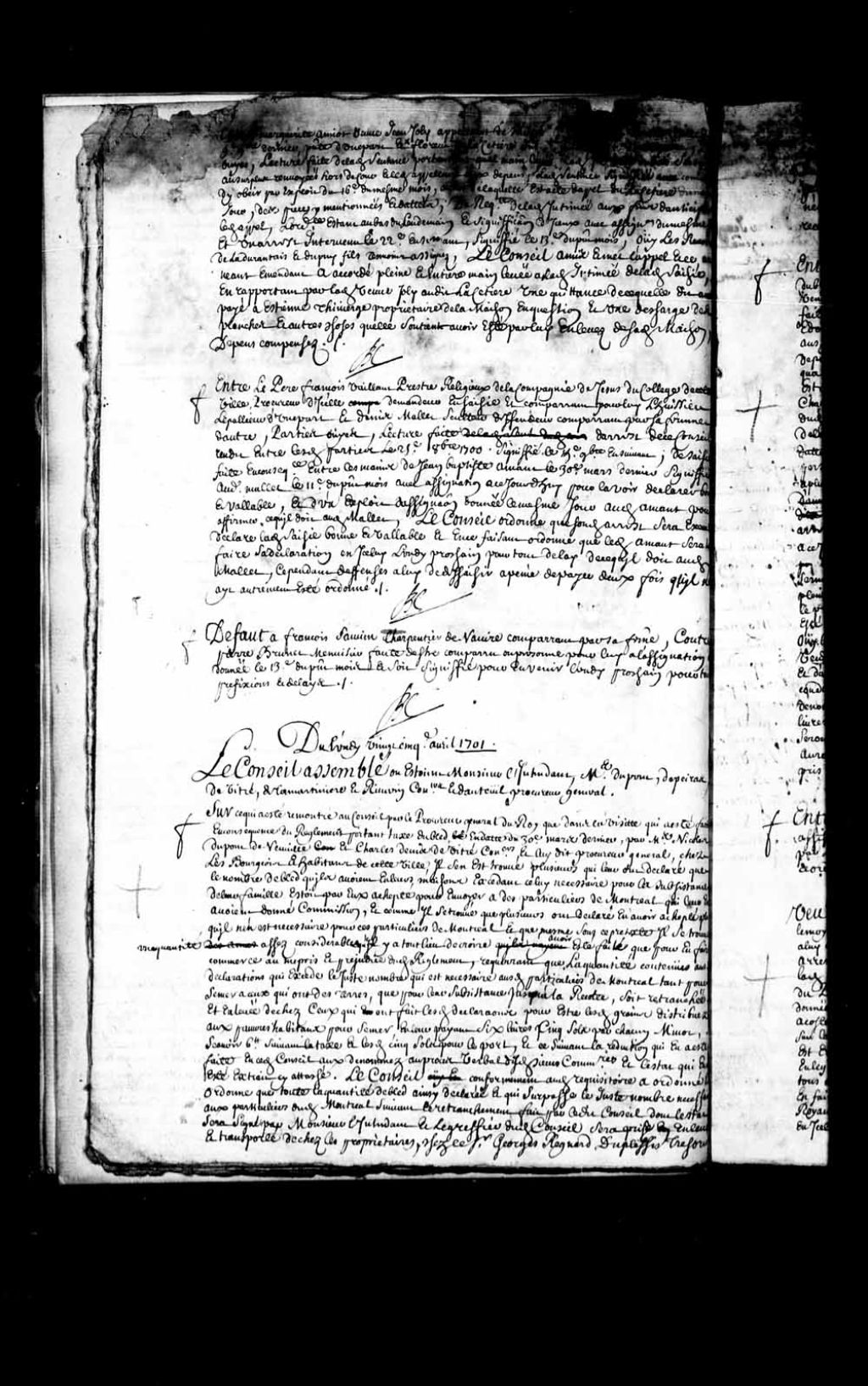 Transcription du texte avec orthographe modernisée : «Du lundi vingt-cinquième avril mille sept cent un. Le Conseil assemblé où étaient Monsieur l'intendant, maîtres Dupont Depeiras, de Vitré, de La Martinière et Riverin conseillers, d'Auteuil procureur général et moi Peuvret greffier en chef. Sur ce qui a été remontré au Conseil par le procureur général du Roi que dans la visite qui a été faite en conséquence du règlement portant taxe du blé en date du 30e mars dernier par maître Nicolas Dupont de Neuville et Charles Denys de Vitré conseillers et lui dit procureur général chez les Bourgeois et habitant de cette ville, il s'en est trouvé plusieurs qui leur ont déclaré que le nombre de blé qu'ils avaient en leurs maisons excédant celui nécessaire pour la subsistance de leurs familles était par eux acheté pour envoyer a des particuliers de Montréal qui leur en avaient donné commission, et comme il se trouve que plusieurs ont déclaré en avoir acheté plus qu'il n'en est nécessaire pour ces particuliers de Montréal et que même sous ce prétexte il se trouve une quantité assez considérable pour qu'il y ait tout lieu de croire que ce soit pour en faire commerce au mépris et préjudice dudit règlement requérant que la quantité contenue aux dites déclarations qui excède le juste nombre qui est nécessaire auxdits particuliers de Montréal tant pour semer à ceux qui ont des terres que pour leur subsistance jusqu'à la récolte, soit retranchée et enlevée de chez ceux qui ont fait lesdites déclarations pour être lesdits Grains distribués aux pauvres pour semer en leur payant six livres cinq sols par chacun minot, savoir 6 livres suivant la taxe et lesdits cinq sols pour le port, et ce suivant la réduction qui en a été faite en ce dit Conseil aux dénommés au procès-verbal desdits sieurs commissaires et l'état qui en a été fait. Le Conseil conformément audit réquisitoire a ordonné et ordonne que toute la quantité de blé ainsi déclarée et surpasse le juste nombre nécessaire aux particuliers dudit Montréal suivant le retranchement fait par ce dit Conseil dont l'état sera signé par Monsieur l'intendant et le greffier dudit Conseil, sera prise, enlevée et transportée de chez les propriétaires chez le sieur Georges Regnard Duplessis trésorier de la marine en ce pays, en payant auxdits propriétaires la somme de six livres cinq sols par chacun minot, pour être lesdits blés distribués par ledit sieur Duplessis aux pauvres habitants pour semer suivant les billets qui seront donnés par lesdits sieurs Dupont, de Vitré et ledit procureur général, lequeldit sieur Duplessis n'en pourra distribuer à qui que ce soit qu'en payant à ceux qui en voudront recevoir le même prix de six livres cinq sols. BOCHART CHAMPIGNY.»