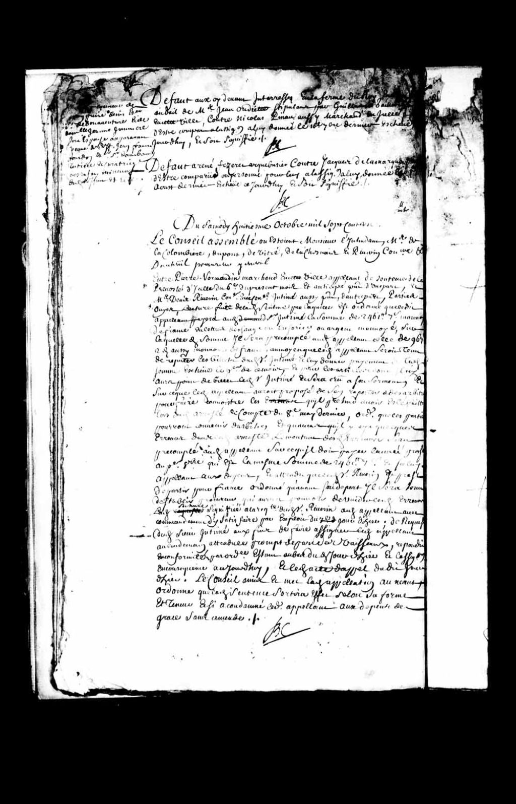 Transcription du texte avec orthographe modernisée : «Défaut aux ci-devant intéressés en la ferme du Roi de ce pays au bail de maître Jean Oudiette stipulés par Guillaume Gaillard marchand en cette ville, contre Nicolas Pinar (Pinard) aussi marchand en icelle comme procureur de Simon Pierre Denis écuyer sieur de Bonaventure et de demoiselle Jeanne Jannière (Jannier) sa femme auparavant veuve de défunt Jean François Bourdon écuyer sieur Dombourg tutrice et curatrice des enfants mineurs dudit défunt et d'elle, faute d'être comparu à l'assignation à lui donnée le seizième septembre dernier, échue ce jourd'hui et soit signifié. BOCHART CHAMPIGNY.»