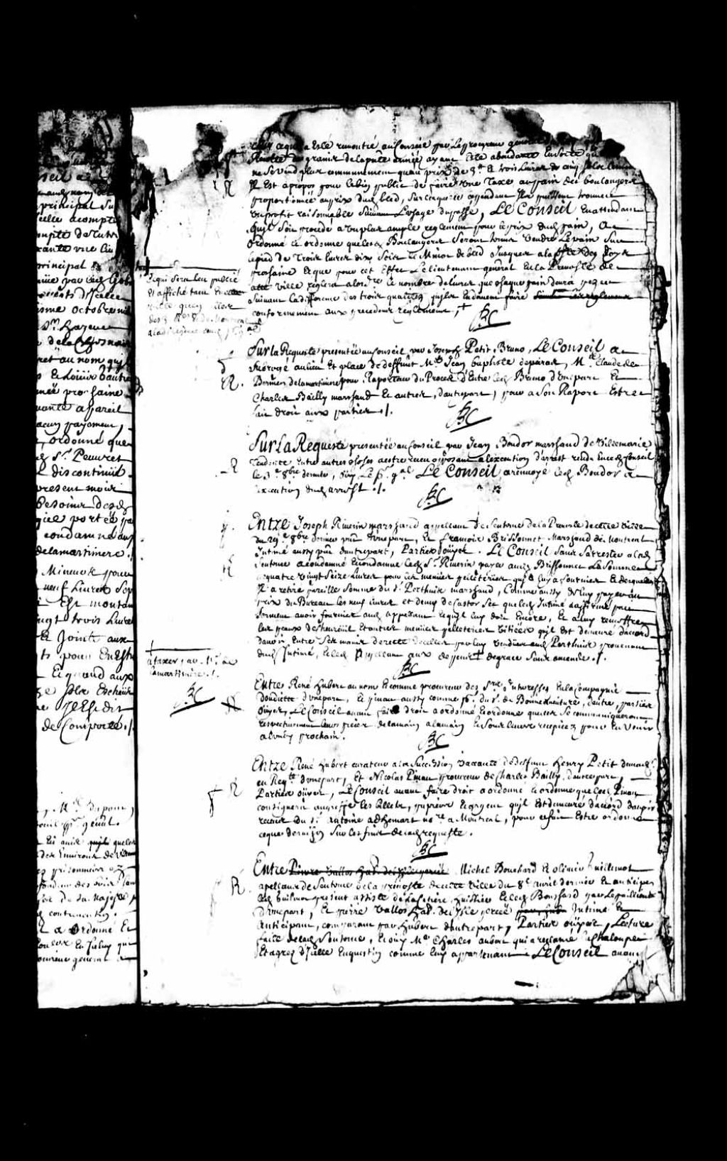 Transcription du texte avec orthographe modernisée : «Sur la requête présentée au Conseil par Joseph Petit Bruno (Bruneau). Le Conseil a subrogé au lieu et place de défunt maître Jean-Baptiste Depeiras, maître Claude de Bermen de La Martinière pour rapporteur du procès d'entre ledit Bruno d'une part, et Charles Bailly marchand et autres créanciers dudit Bruno, d'autre part, pour à son rapport être fait droit aux parties, BOCHART CHAMPIGNY.»
