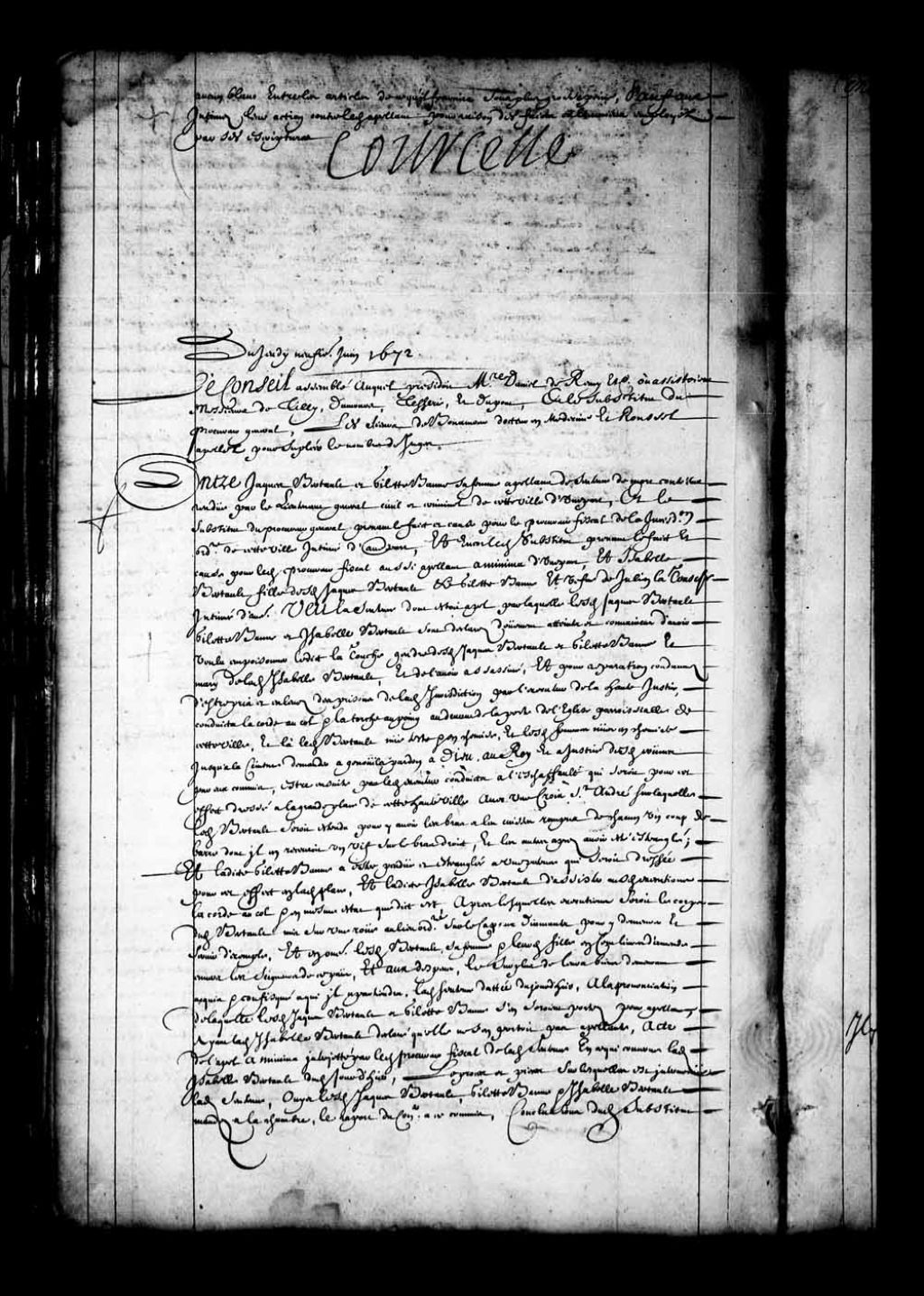 Transcription du texte avec orthographe modernisée : «Du jeudi neuvième juin 1672. Le Conseil assemblé auquel présidait messire Daniel de Rémy etc, où assistaient Messieurs de Tilly, Damours, Tesserie, et Dupont, et le substitut du procureur général, les sieurs de Bonamour docteur en médecine et Roussel appelés pour suppléer le nombre de juges. Entre Jacques BERTAULT et Gillette BAUNE sa femme appelant de sentence de mort contre eux rendue par le lieutenant général civil et criminel de cette ville d'une part; et le substitut du procureur général, prenant le fait et cause pour le procureur fiscal de la juridiction ordinaire de cette ville intimé d'autre part, et encore ledit substitut prenant le fait et cause pour ledit procureur fiscal aussi appelant a minima d'une part, et Isabelle BERTAULT fille desdits Jacques Bertault et Gillette Baune et veuve de Julien LaTousche intimée d'autre. Vu la sentence dont était appel par laquelle lesdits [...]