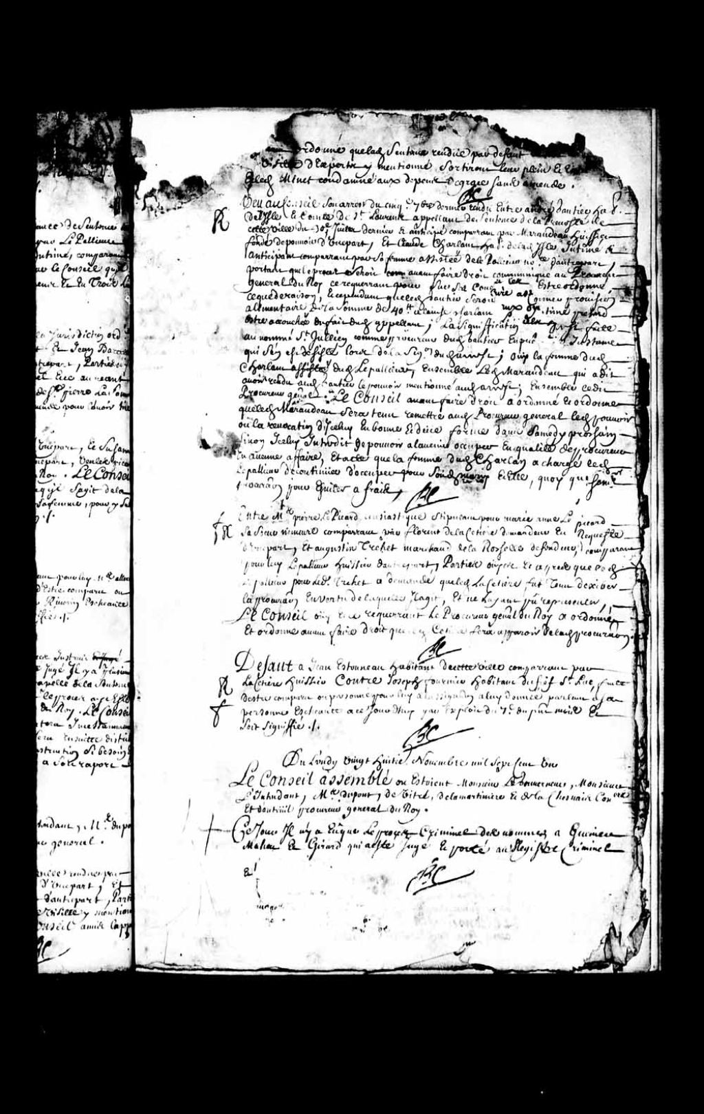 Transcription du texte avec orthographe modernisée : «Défaut à Jean Estourneau (Létourneau) habitant de cette ville comparant par La Cetière huissier Contre Joseph fournier habitant du fief Saint-Luc, faute d'être comparu ou personne pour lui à l'assignation à lui donnée parlant à sa personne échéante à ce jourd'hui par exploit du 7e du présent mois Et Soit signifié. Bochart Champigny.»