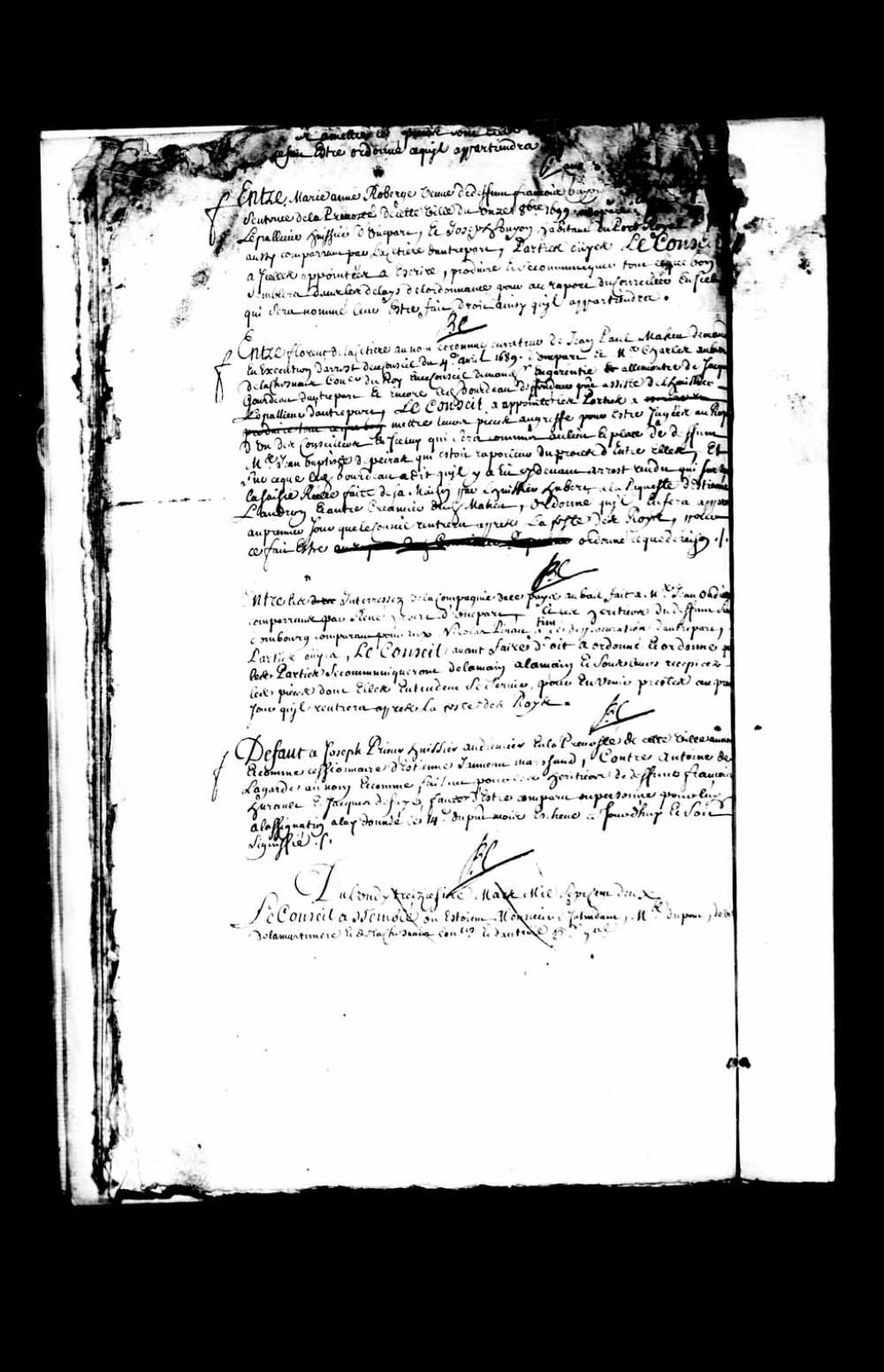 Transcription du texte avec orthographe modernisée : «Défaut à Joseph Prieur huissier audiencier en la prévôté de cette ville au nom et comme cessionnaire de Etienne Janneau (Janot) marchand, contre Antoine de Lagarde faisant pour les héritiers de défunt François Hurault et de Jacques defoye (De la Faye), faute d'être comparu ou personne pour lui à l'assignation à lui donnée le quatorze du présent mois échue ce jourd'hui et soit signifié. BOCHART CHAMPIGNY.»