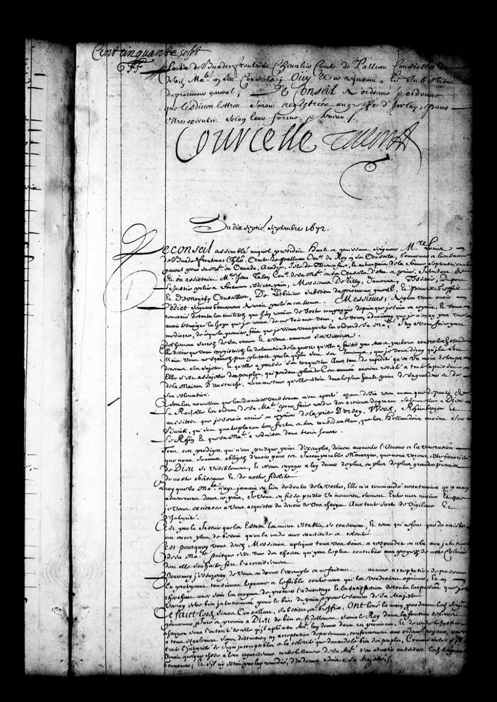 Transcription du texte avec orthographe modernisée : «Du dix-septième septembre 1672. Le Conseil assemblé auquel présidait haut et puissant seigneur messire Louis de Buade Frontenac chevalier comte de Palluau conseiller du Roi en ses Conseils, gouverneur et lieutenant général pour sa Majesté en Canada, Acadie, île de Terre-Neuve, et autres pays de la France septentrionale, et où assistaient messire Jean Talon conseiller de sa Majesté en ses Conseils d'état et privé, intendant de la justice, police et finances lesdits pays; Messieurs de Tilly, Damours, Tesserie, Dupont et DeMouchy, conseillers, de Lotbinière substitut du procureur général, et Peuvret greffier; ledit seigneur gouverneur aurait parlé en ces termes. Messieurs. Après vous avoir remercié de toutes les civilités que j'ai reçues de votre compagnie depuis que je suis en ce pays, et vous avoir témoigné la joie que je ressens de me voir avec vous, je vous avouerai que je n'en ai [...]