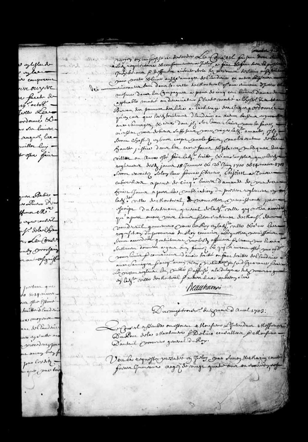 - Transcription du texte avec orthographe modernisée : «Du vingt-troisième dudit mois d'avril 1703. Le Conseil assemblé où étaient Monsieur l'intendant Messieurs DuPont, de la Martinière et Delino (De Lino) conseillers et Monsieur d'Auteuil procureur général du Roi. Vu la requête présentée en icelui par Simon et marin courtois frères jumeaux âgés de vingt-quatre ans ou environ enfants et héritiers de défunt Bertrand Courtois et Marie Hallée (Halay) leurs père et mère tendante pour les raisons y contenues à être relevés de leur minorité, et à ce qu'il plût à la cour leur accorder lettres d'émancipation d'âge, attendu qu'il n'y a point de chancellerie établie en ce pays ouï le procureur général du Roi. Le Conseil faisant droit sur ladite requête a accordé et accorde auxdits Simon et marin Courtois frères lettres d'émancipation d'âge qui leur seront délivrées adressantes au lieutenant général de cette ville de Québec en la manière accoutumée. BEAUHARNOIS.»