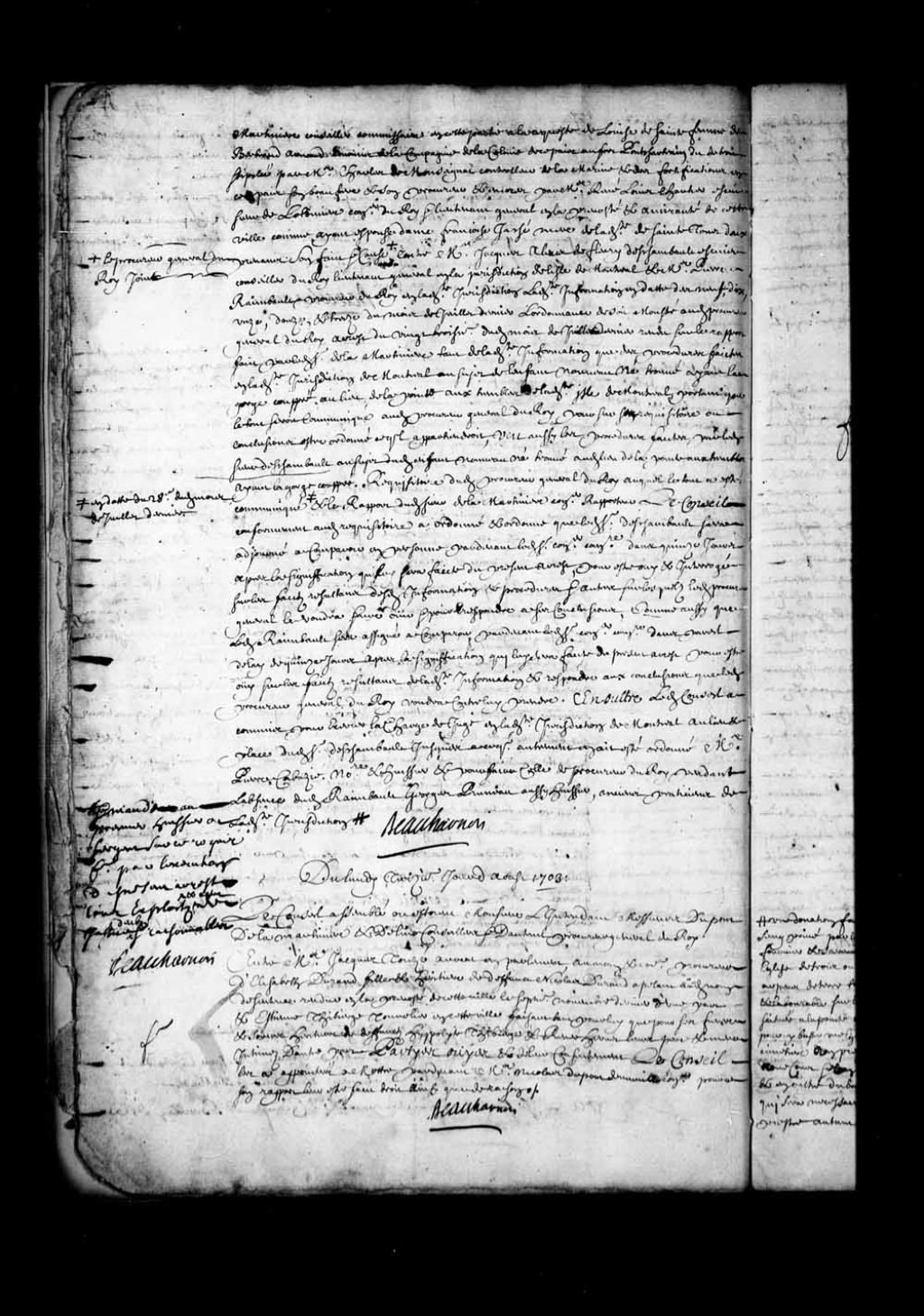 Transcription du texte avec orthographe modernisée : «Du lundi treizième jour d'août 1703. Le Conseil assemblé où étaient Monsieur l'intendant, Messieurs Dupont, de la Martinière et Delino (De Lino) conseillers et d'Auteuil procureur général du Roi. Entre maître Jacques TOUZÉ avocat en parlement au nom et comme procureur de Elisabeth Durand fille et héritière de défunt Nicolas Durand appelant audit nom de sentence rendue en la prévôté de cette ville le septième novembre dernier d'une part et Etienne THIBIERGE, tonnelier en cette ville faisant tant pour lui que pour ses frères et soeurs héritiers de défunt Hippolyte Thibierge et Renée Hervet (Hervé) leurs père et mère intimés d'autre part. Parties ouïes et de leur consentement, le Conseil les a appointées à mettre par-devant maître Nicolas Dupont de Neuville conseiller pour son rapport leur être fait droit ainsi que de raison. BEAUHARNOIS.»