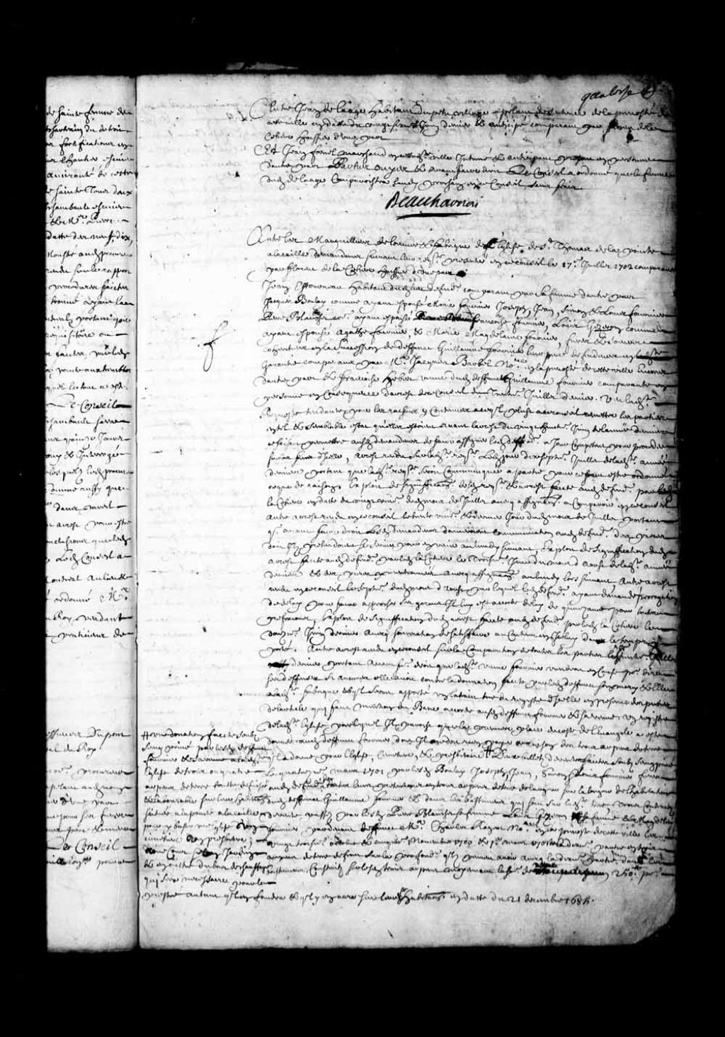 Transcription du texte avec orthographe modernisée : «Entre les marguilliers de l'oeuvre et fabrique de l'église de Saint-Thomas de la Pointe à la Caille demandeurs suivant leur requête présentée en ce conseil le 17e juillet 1702 comparant par Florent de Lacetière huissier d'une part, Jean ESTOURNEAU (Létourneau) habitant dudit lieu défendeur comparant par sa femme d'autre part Jacques Boulay (Boulet) comme ayant épousé Marie Fournier, Joseph, Jean, Simon et Louis Fournier, Pierre Blanchet comme ayant épousé Françoise Fournier, Louis GEZERON (Gesseron) comme ayant épousé Agathe Fournier, et Marie Madeleine Fournier frères et soeurs cohéritiers en la succession de défunt Guillaume Fournier leur père défendeurs en garantie comparant par maître Jacques Barbel notaire en la prévôté de cette ville encore d'autre part et Françoise Hébert veuve dudit défunt Guillaume Fournier comparante en personne en conséquence d'arrêt de ce conseil du trentième juillet dernier. Vu ladite requête tendante pour les raisons y contenues à ce qu'il plût à ce conseil remettre les parties en tel et semblable état qu'elles étaient avant l'arrêt du vingt-huitième juin de l'année dernière ce faisant permettre auxdits demandeurs de faire assigner ledit défendeur à jour compétent pour procéder sur les fins d'icelle, arrêt rendu sur ladite requête ledit jour dix-septième juillet de ladite année dernière portant que ladite requête serait communiquée à partie pour ce fait être ordonné ce que de raison. exploit de signification desdites requêtes et arrêt faite audit défendeur par LaCetière en date du vingt et unième dudit mois de juillet avec assignation à comparaître en ce conseil, autre arrêt rendu en ce conseil le trente et unième et dernier jour dudit mois de juillet portant qu'avant faire droit lesdits demandeurs donneraient communication audit défendeur des pièces dont Ils prétendaient se servir pour en venir au lundi suivant, exploit de signification dudit arrêt faite audit défendeur par ledit LaCetière le troisième jour du mois d'août de ladite année dernière et des pièces y mentionnées avec assignation au lundi lors suivant, autre arrêt rendu en ce Conseil le septième dudit mois d'août par lequel ledit défendeur ayant demandé prorogation du délai pour faire approcher ses garant il lui est accordé délai de quinzaine pour toutes préfixion. exploit de signification dudit arrêt faite audit défendeur par ledit LaCetière le douzième juin dernier avec assignation de satisfaire au contenu en icelui dans le temps y porté. Autre arrêt rendu en ce conseil sur la comparution de toutes les parties le trentième jour juillet dernier portant avant faire droit que ladite veuve Fournier viendrait en cause pour dire ses défenses si aucunes elle avait contre la donation faite par ledit défunt son mari et elle à ladite fabrique et qu'il serait apporté un extrait tiré du registre d'icelle en présence des parties de l'article qui fait mention du banc accordé auxdits défunt Fournier et sa veuve, un registre de ladite église par lequel il paraît que la première place du côté de l'Évangile a été donnée audit défunt Fournier dont il ne doit rien payer à raison des trois arpents de terre qu'il a donné pour l'église, cimetière et presbytère une donation faite sous seing privé par lesdits défunt Fournier et sa veuve à ladite église de trois ou quatre arpents de terre toute défrichée et labourable sur leur habitation située à la Pointe à la Caille pour y bâtir une église, un cimetière, un presbytère, une Cour et un jardin et en outre du bois de chauffage qui sera nécessaire pour le prêtre autant qu'il en faudra et qu'il y en aura sur leur dite habitation en date du 21 décembre 1686. Deux billets de vente faites sous seing privé le quatorzième mars 1701 par lesdits Boulay, Joseph, Jean, Simon et Louis Fournier frères audit défendeur de toutes leurs prétentions en trois arpents de terre de largeur sur la longueur de l'habitation dudit défunt Guillaume Fournier et dans les bâtiments qui sont sur ladite terre, trois contrats de vente passés par lesdits Pierre Blanchet sa femme Louis Gezeron sa femme et Madeleine Fournier par-devant défunt maître Charles Rageot notaire en la prévôté de cette ville les vingt-troisième octobre et cinquième novembre 1700 et premier mars 1701 de la dixième partie en trois arpents de terre de front sur la profondeur qu'ils peuvent avoir avec la dixième partie dans les bâtiments construits sur lesdits trois arpents moyennant la somme de 250 livres pour chaque part et portion. Ouï lesdits comparants ensemble le procureur général du Roi. Le Conseil sans avoir égard à la donation faite par lesdits défunt Fournier et sa veuve à ladite église de Saint-Thomas a ordonné et ordonne que ladite église jouira seulement de trois arpents de terre qui seront le plus à sa commodité et à celle du curé d'icelle, que le surplus appartiendra audit Létourneau qui ne pourra prétendre aucune place dans le banc accordé auxdits Fournier et sa veuve en considération du don qu'ils ont fait desdits trois arpents de terre et ci a condamné lesdits demandeurs aux dépens, sauf à prononcer sur la donation du bois pour le chauffage du curé de ladite église jusqu'à ce qu'il y ait partie capable, et au surplus renvoyé les héritiers dudit défunt Fournier de la demande à eux faite par ledit Letourneau en garantie avec dépens envers lesdits Boulay, Joseph, Jean, Simon et Louis Fournier qui n'ont point passé de contrat de vente, et à l'égard desdits Blanchet, Gezeron et Madeleine Fournier qui ont passé contrat de vente aussi ledit Létourneau les a condamnés aux dépens pour ce qui les regarde seulement. BEAUHARNOIS.»