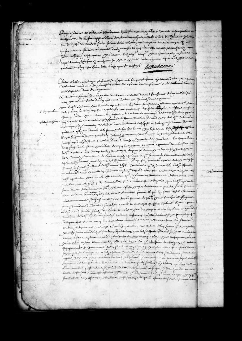- Transcription du texte avec orthographe modernisée : «Entre Robert LABERGE et Françoise GOSSE (Gausse) ou LEBORGNE sa femme habitant de Beaupré appelants de sentence rendue en la prévôté de cette ville en date du vingt-deuxième avril de l'année dernière mille sept cent deux d'une part et Antoine HUPPÉ dit LAGROIS (Lagroix) et Marie Ursule DURAND sa femme de lui autorisée à la poursuite de ses droits habitants de Beauport intimés d'autre part. Vu ladite sentence par laquelle en entérinant les lettres de restitution obtenues en ce conseil par lesdits intimés le vingt et un juillet mille six cent quatre-vingt-dix-huit les parties sont remises au même état qu'elles étaient avant la passation du contrat de mariage d'entre lesdits intimés en ce qui regarde la renonciation qu'ils font à la succession de défunt Nicolas Durand père de ladite intimée et de ce qu'ils pouvaient prétendre dans les biens de ladite Gosse ou Leborgne et avant la quittance qu'ils ont donnée de la somme de six cents livres par eux reçue desdits appelants et en ce faisant ordonné que lesdits intimés pourront poursuivre le partage des biens de la succession dudit défunt Nicolas Durand ainsi qu'il appartiendra par-devant les juges des lieux sauf l'appel sans préjudice de ce qui leur pourra ci-après appartenir dans les biens de ladite appelante lors de son décès, au moyen de quoi et avant procéder auxdits partages lesdits intimés seront tenus de rendre auxdits appelants ladite somme de six cents livres et lesdits appelants condamnés aux dépens de l'instance. Requête présentée en ce conseil par lesdits intimés le septième juillet de ladite année 1698 contenante qu'en l'année 1661 ledit défunt Nicolas Durand pour lors habitants en ladite côte de Beaupré contracta mariage avec ladite appelante, par lequel est convenu qu'ils seront en communauté de tous biens meubles, acquêts et conquêts; immeubles suivant la coutume du pays, que ladite appelante serait douaire de la somme de 300 livres pour une fois payer seulement à prendre sur le plus clair de leurs biens soit en ce pays soit en l'ancienne France et qu'il lui serait loisible de renoncer à la communauté et ce faisant de reprendre la somme de 400 livres pour ses hardes et Joyaux sans préjudice du douaire spécifié, que de ce mariage est issue l'intimée et peu après ledit Durand décéda et ladite appelante convola en secondes noces avec l'appelant au grand malheur de ladite intimée puisqu'oubliant l'affection qu'elle devait à son enfant, et qui l'obligeait à conserver ce qui lui appartenait très légitimement, elle n'a travaillé et dans son contrat, et depuis ce mariage qu'à l'en dépouiller, car au lieu de lui faire élire un tuteur pour conserver ses droits, et surtout, l'habitation que ledit défunt Durand son père avait plus de cinq à six ans, devant que d'avoir contracté son mariage et qui par conséquent n'a point été en leur communauté, elle n'a travaillé qu'à la faire tomber quoique très injustement en la communauté de son second mari, et pour y parvenir elle a fait estimer dans son contrat de mariage avec ledit appelant par ses amis et ceux de son second mari sans avoir appelé personne pour conserver les droits de l'intimée, pas même le procureur fiscal de ladite seigneurie de Beaupré, tant la quantité des travaux faits sur ladite habitation, que leur valeur et les meubles, estimations si préjudiciables à l'intimée et si peu justes que des terres toutes défrichées n'ont été estimées par eux qu'à la somme de cinquante livres l'arpent, quoi qu'il soit notoire à un chacun que les terres défrichées en ce temps la étaient toujours estimées à cents livres l'arpent et les bâtiments, qui n'ont été estimés qu'à cent vingt livres, consistaient en une maison de vingt pieds de long de pièce sur pièce avec une cheminée de pierre et maçonne et une grange de trente pieds ou environ, ce qui fait voir que ces articles n'ont pas été mis au quart de leur valeur, ainsi par ces exemples l'intimée ne peut pas douter qu'ils n'aient diminué la juste valeur de chaque chose de plus de moitié, outre ce qu'ils y auront omis puisque les prétendus estimateurs étaient les conviés au contrat desdits appelants qui n'aspiraient qu'à faire réussir le mariage pour lequel Ils étaient assemblés quelque perte qu'en dû souffrir l'intimée qui était un enfant sans défense et sans défenseurs; ensuite l'intimée ayant été élevée par eux et les ayant servis de son mieux, lesdits appelants n'aspirant qu'à la dépouiller entièrement pensèrent à la marier au plutôt et pour cet effet la contractèrent des douze ans à un nommé François Serail maçon, destitué d'esprit, qui par son contrat achetait l'intimé puisqu'il s'était obligé de faire audit appelant une maison de pierre et de chaux de trente pieds de long et de lui rendre faite et parfaite la clef à la main et que au moyen de ce il lui donnerait moitié en l'habitation qui appartenait toute entière à l'intimée, mais à cet âge en ayant porté sa plainte à Monsieur Duchesneau pour lors intendant il empêcha l'exécution du contrat, en défendant le mariage, et ensuite acquiesçant Ils la contractèrent avec ledit intimé pour lors aussi mineur, ses parents stipulants pour lui, qui n'ayant aucune connaissance de ce qui appartenait à l'intimée, consentirent a tout ce que voulurent lesdits appelants et c'est en cet endroit que on connaîtra jusque ou va l'affection d'une mère pour son second mari au préjudice d'une pauvre orpheline destituée de tuteur et défenseur, car non seulement Ils l'ont contrainte de se contenter de la somme de 600 livres avec un habit deux plats et deux assiettes pour ce qui lui pouvait comporter et appartenir sur l'habitation de feu son père, quoi qu'il soit vraie qu'elle lui appartienne toute entière par la coutume, mais encore Ils ne s'obligeaient à payer cette somme que dans six années et 