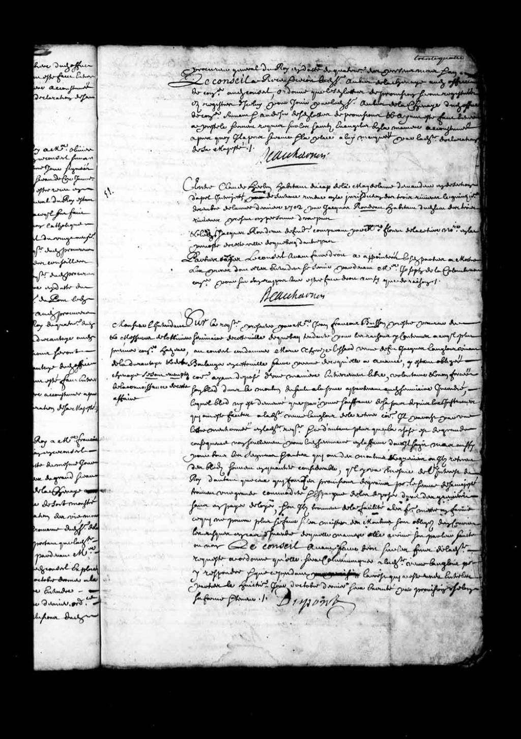 Transcription du texte avec orthographe modernisée : «Entre Claude HERBIN habitant du cap de la Madeleine demandeur en désertion d'appel interjeté de sentence rendue en la juridiction des Trois-Rivières le quinzième décembre de l'année dernière 1702 par Jacques Rondeau habitant dudit lieu des Trois-Rivières présent en personne d'une part et ledit Jacques RONDEAU défendeur comparant par maître Florent de Lacetière notaire en la prévôté de cette ville de Québec d'autre part. Parties ouïes, le Conseil avant faire droit à appointées lesdites parties à mettre les pièces dont elles entendent se servir par-devant maître Joseph de la Colombière (Lacolombière) conseiller pour sur son rapport leur être fait droit ainsi que de raison. BEAUHARNOIS.»