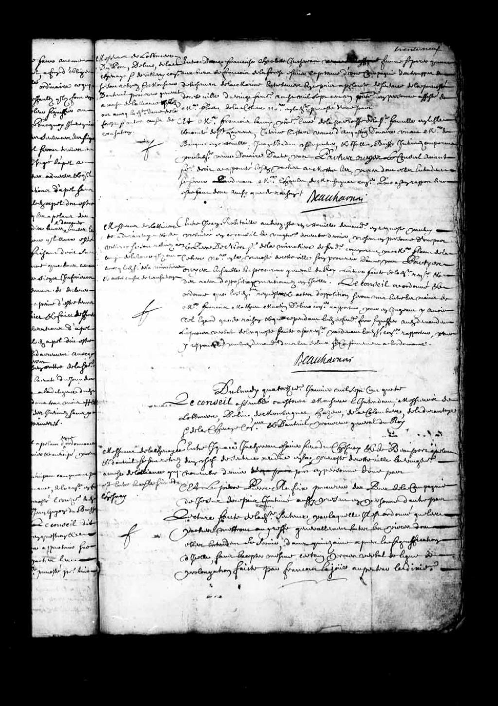 Transcription du texte avec orthographe modernisée : «Du lundi quatorzième janvier mille sept cent quatre. Le Conseil assemblé où étaient Monsieur l'intendant, Messieurs de Lotbinière, Delino (De Lino), de Monseignat, Hazeur, de la Colombière (Lacolombière), de Ladurantaie (Ladurantaye) et de Lachesnaie conseillers et d'Auteuil procureur général du Roi. Messieurs de LaChenaie (Lachesnaye) et d'Auteuil se sont retirés à cause de l'alliance qui est entre eux et le sieur du Chesnay. Entre Ignace JUCHERRAU (Juchereau) écuyer sieur DU CHESNAY (Duchesnay) et de Beauport appelant d'un chef de sentence rendue en la prévôté de cette ville le vingtième novembre dernier présent en personne d'une part et le père Pierre Rafeix procureur des pères de la compagnie de Jésus de ce pays intimé aussi présent en personne d'autre part, lecture faite de ladite sentence par laquelle il est ordonné que les parties mettront au greffe généralement toutes les pièces dont elles entendent se servir, dans quinzaine après la signification d'icelle, sans excepter même certain procès-verbal de ligne de prolongation faite par François Lajoue arpenteur le dixième février 1696 auquel en jugeant on aurait tel égard que de raison les dépens réservés, de la requête d'appel dudit appelant, de l'ordonnance enfin d'icelle de l'exploit d'assignation donnée en conséquence audit intimé d'un écrit produit par ledit intimé pour réponses à ladite requête ouï lesdites parties ensemble maître Olivier Morel de Ladurantaie (Ladurantaye) conseiller faisant fonction de procureur général en cette affaire à cause de l'alliance du procureur général avec ledit appelant, le Conseil dit qu'il a été mal jugé et bien appelé par l'appelant pour le chef dont est appel émendant et corrigeant ordonne que le procès-verbal dudit LaJoue mentionné dans ladite sentence sera rejeté de la procédure de l'intimé que ledit conseil a condamné aux dépens de l'appel et au surplus sera ladite sentence exécutée selon sa forme et teneur. BEAUHARNOIS.»