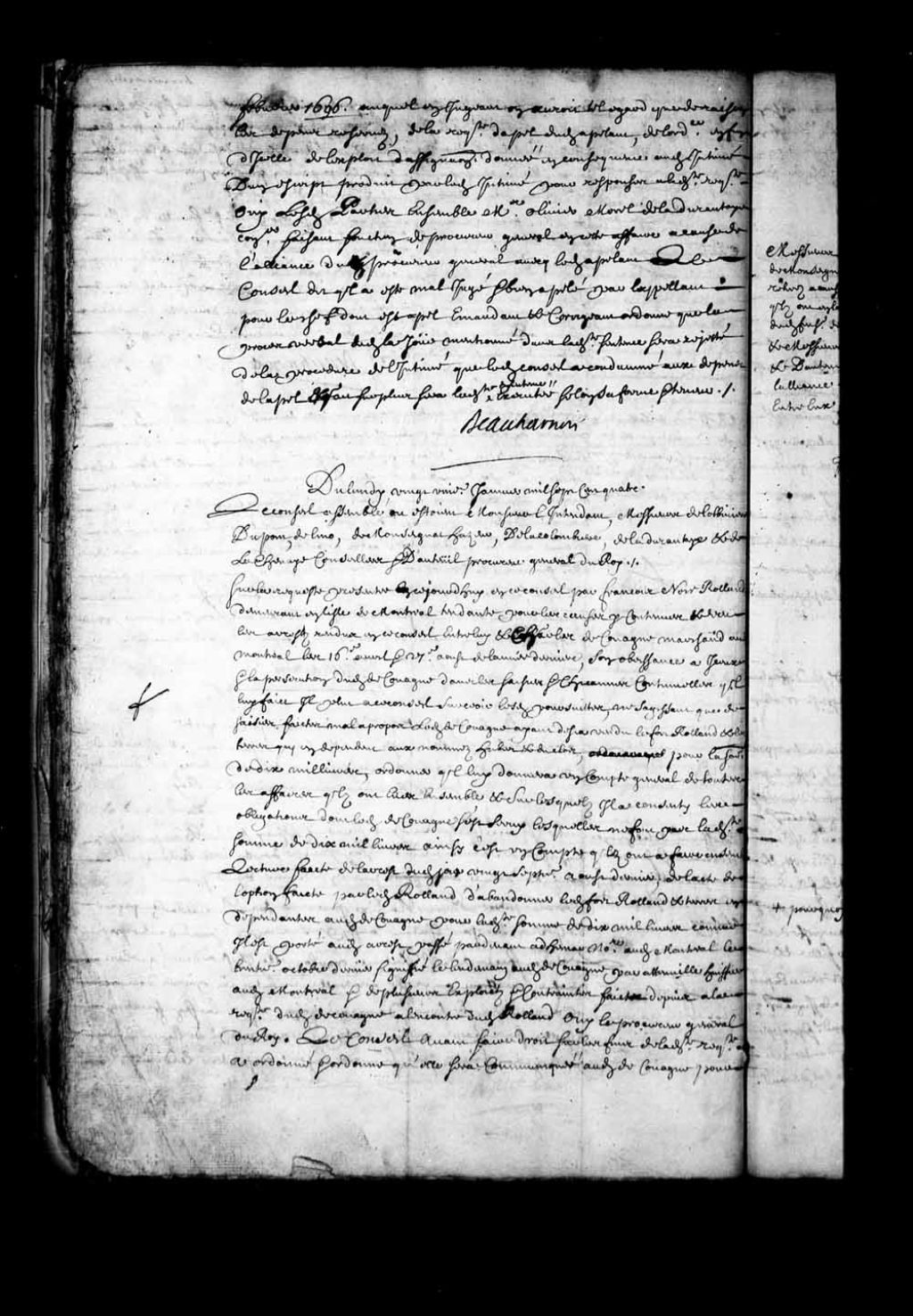 - Transcription du texte avec orthographe modernisée : «Du lundi vingt et unième. janvier mille sept cent quatre. Le Conseil assemblé où étaient Monsieur l'intendant, Messieurs de Lotbinière Dupont, Delino (De Lino), de Monseignat, Hazeur, de la Colombière (Lacolombière), de Ladurantaie (Ladurantaye) et de Lachenaie conseillers et d'Auteuil procureur général du Roi. Sur la requête présentée ce jourd'hui en ce conseil par François Noir Rolland demeurant en l'île de Montréal tendante pour les causes y contenues et vu les arrêts rendus en ce conseil entre lui et Charles de Couagne marchand audit Montréal les 16e avril et 27e août de l'année dernière, son obéissance à iceux et la persécution dudit de Couagne dans les saisies et chicanes continuelles qu'il lui fait il plut à ce conseil surseoir lesdites poursuites, ne s'agissant que de saisies faites mal à propos ledit de Couagne ayant déjà vendu le fort Rolland et les terres qui en dépendent aux nommés Hubert et Duclos, pour la somme de dix mille livres, ordonner qu'il lui donnera un compte général de toutes les affaires qu'ils ont eues ensemble et sur lesquels il a consenti les obligations dont ledit de Couagne s'est servi lesquelles ne font pas ladite somme de dix mille livres ainsi c'est un compte qu'ils ont à faire ensemble. Lecture faite de l'arrêt dudit jour vingt-septième août dernier, de l'acte de l'option faite par ledit Rolland d'abandonner ledit fort Rolland et terres en dépendant audit de Couagne pour ladite somme de dix mille livres comme il est porté audit arrêt passé par-devant Adhémar notaire audit Montréal le trentième octobre dernier signifié le lendemain audit de Couagne par Attenville (Hatanville) huissier audit Montréal et de plusieurs exploits et contraintes faits depuis à la requête dudit de Couagne à l'encontre dudit Rolland ouï le procureur général du Roi. Le Conseil avant faire droit sur les fins de ladite requête a ordonné et ordonne qu'elle sera communiquée audit de Couagne pour par lui répondre sur le contenu en icelle trois semaines après la signification qui lui en sera faite et cependant donné mainlevée audit Rolland des grains et bestiaux sur lui exécutés à la requête dudit de Couagne sans que pour ce il en puisse vendre en aucune manière et afin que cela soit notoire sera le présent arrêt lu à l'audience de la juridiction dudit Montréal les dépens réservés. BEAUHARNOIS.»