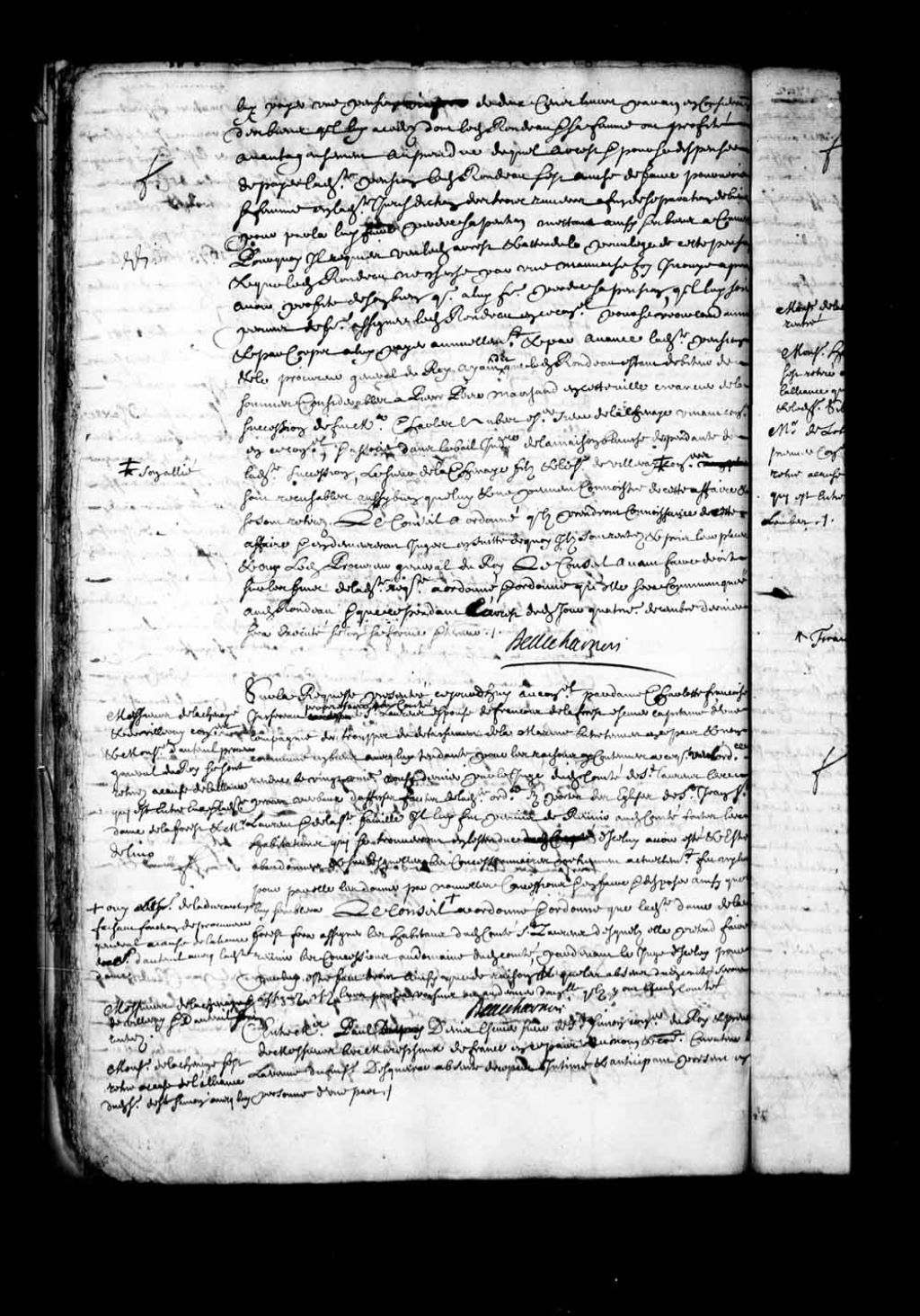 Transcription du texte avec orthographe modernisée : «Messieurs de Lachenaie et de Villeray conseillers et Monsieur d'Auteuil procureur général du Roi se sont retirés à cause de l'alliance qui est entre eux et ladite dame de Laforest et Monsieur Delino (De Lino). Sur la requête présentée ce jourd'hui au Conseil par dame Charlotte Françoise Juchereau propriétaire du comté de Saint-Laurent épouse de François de Laforest écuyer capitaine d'une compagnie des troupes du détachement de la marine entretenues en ce pays et non commune en biens avec lui tendante pour les raisons y contenues a ce que Vu l'ordonnance rendue le vingt et unième. août dernier par le juge dudit comté de Saint-Laurent leurs procès-verbaux d'affiches faites de ladite ordonnance aux portes des églises de Saint-Jean Saint-Laurent et de la Sainte-Famille il lui fut permis de réunir audit comté toutes les habitations qui se trouveront en l'étendue d'icelui avoir été et être abandonnées et sur lesquelles les concessionnaires ne tiennent actuellement feu ni lieu pour par elle les donner par nouvelles concessions et en faire et disposer ainsi que bon lui semblera, le Conseil ouï le sieur de Ladurantaie (Ladurantaye) faisant fonction de procureur général à cause de l'alliance du sieur d'Auteuil avec ladite dame a ordonné et ordonne que ladite dame de La forêt fera assigner les habitants dudit comté Saint-Laurent desquels elle prétend faire réunir les concessions au domaine dudit comté, par-devant le juge d'icelui pour par lui être fait droit ainsi que de raison et que les absens dudit comté seront assignés chez leur proches voisins ou au dernier domicile qu'ils y ont eu audit comté. BEAUHARNOIS.»