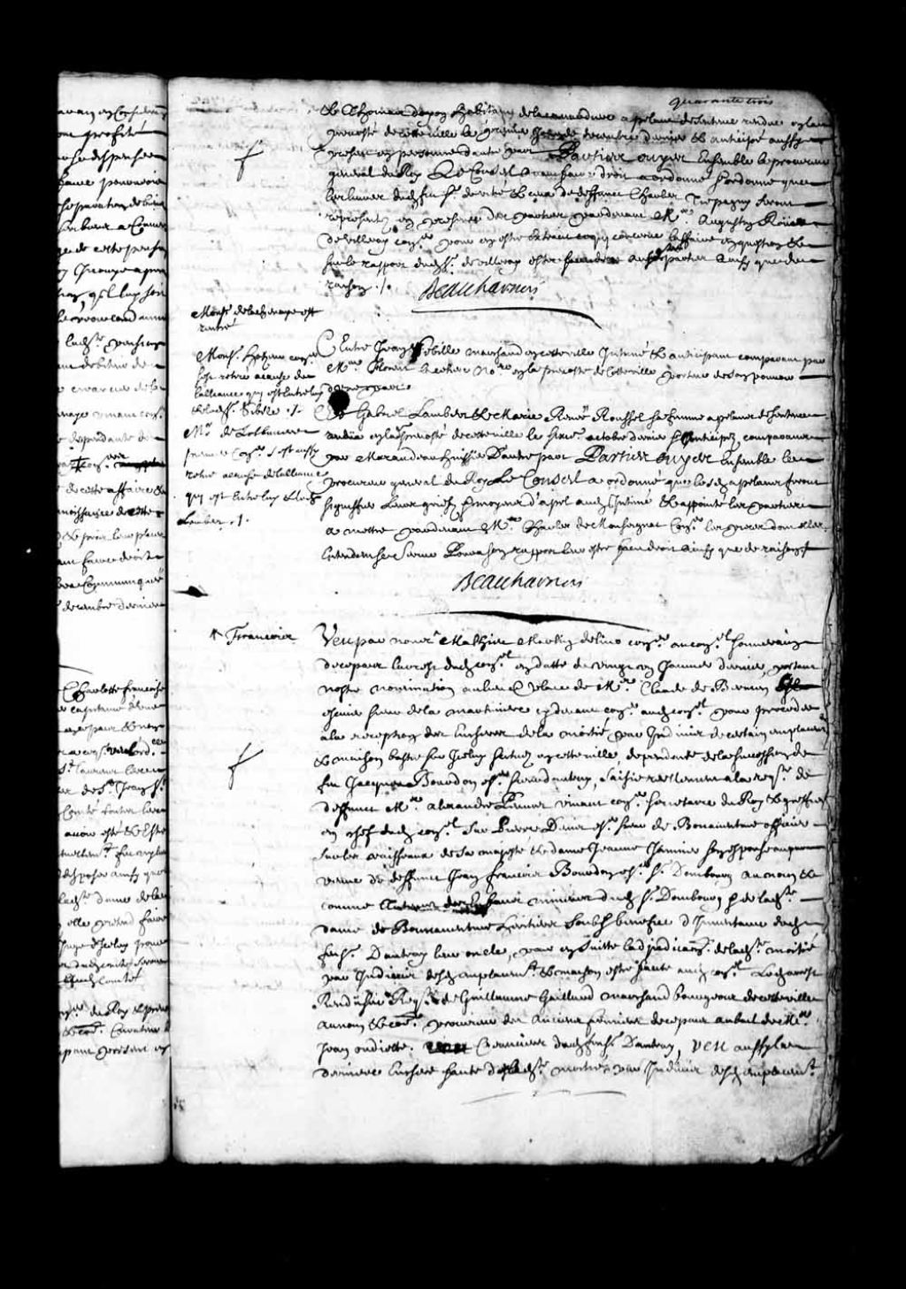 Transcription du texte avec orthographe modernisée : «Vu par nous François Mathieu Martin Delino (De Lino) conseiller en ce Conseil souverain de ce pays l'arrêt dudit Conseil en date du vingt et un janvier dernier, portant notre nomination au lieu et place de maître Claude de Bermen écuyer sieur de La Martinière ci-devant conseiller audit Conseil pour procéder à la réception des enchères de la moitié par indivis de certain emplacement et maison bâtie sur icelui situés en cette ville, dépendante de la succession de feu Jacques Bourdon écuyer sieur dautray, saisie réellement à la requête de défunt maître Alexandre Peuvret vivant conseiller secrétaire du Roi et greffier en chef dudit Conseil sur Pierre Denis écuyer sieur de Bonaventure officier sur les vaisseaux de sa majesté et dame Jeanne Jannier son épouse auparavant veuve de défunt Jean François Bourdon écuyer sieur Dombourg au nom et comme tuteur des enfants mineurs dudit sieur Dombourg et de ladite dame de Bonaventure héritiers sous bénéfice d'inventaire dudit feu sieur Dautray (D'Autray) leur oncle, pour ensuite l'adjudication de ladite moitié par indivis desdits emplacement et maison être faite audit Conseil ledit arrêt rendu sur requête de Guillaume Gaillard marchand bourgeois de cette ville au nom et comme procureur des anciens fermiers de ce pays au bail de maître Jean Oudiette. créanciers dudit feu sieur Dautray, vu aussi la dernière enchère faite de ladite moitié par indivis desdits emplacement et maison par-devant ledit sieur de La Martinière le quatrième décembre 1702 par ledit gaillard à la somme de deux mille sept cents livres signification dudit arrêt faite au sieur Nicolas Pinaut (Pineau, Pinault) marchand bourgeois de cette dite ville au nom et comme procureur desdits sieur et dame de Bonaventure aux noms qu'ils agissent avec déclaration qu'il serait à ces jour lieu et heure procédé par-devant nous à la réception desdites enchères à ce qu'il eût audit nom à y faire trouver enchérisseurs si bon lui semblait et ledit gaillard audit nom nous ayant requis de vouloir procéder aux dites enchères nous avons faits crier ladite moitié par indivis desdites maison et emplacement par Marandeau (Maranda) huissier sur ladite dernière enchère ainsi qu'il en suit par ledit Gaillard à la somme de deux mille sept cents livres, par le sieur LaCetière à deux mille sept cent cinquante livres et attendu qu'il ne s'est trouvé plus hauts enchérisseurs nous avons remis a huitaine à pareils lieu et heure fait à Québec à l'office du Conseil ledit jour onzième février 1704. DELINO.»