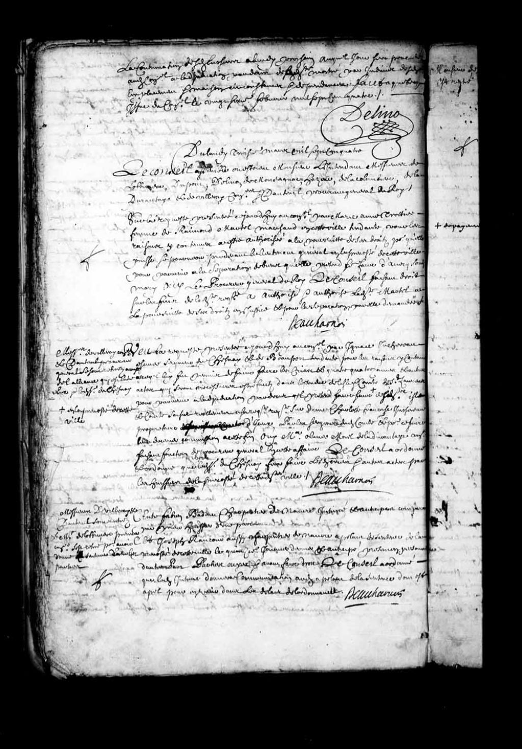 Transcription du texte avec orthographe modernisée : «Messieurs de Villeray et d'Auteuil sont rentrés et Monsieur de Lotbinière premier conseiller s'est retiré pour avoir donné la sentence d'entre les parties. Entre Fabien BADEAU charpentier de navires intimé et anticipant comparant par Prieur huissier d'une part et Joseph RANCOUR (Rancourt) aussi charpentier de navires appelant de sentence de la prévôté de cette ville le quinzième janvier dernier et anticipé présent en personne d'autre Part. Parties ouïes et avant faire droit. Le Conseil a ordonné que ledit intimé donnera communication audit appelant de la sentence dont est appel pour en venir dans les délais de l'ordonnance. BEAUHARNOIS.»