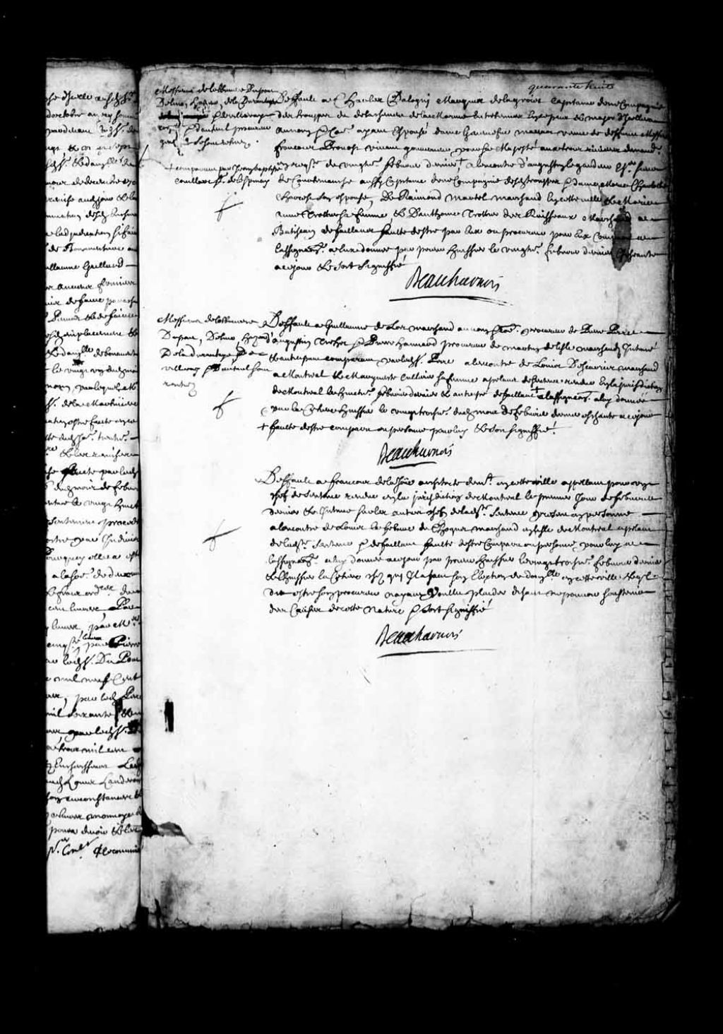 Défaut en faveur de François de Lajoue, architecte de Québec, appelant d'un chef de sentence rendue en la Juridiction royale de Montréal, le 1er février 1704 et sur les autres chefs de la dite sentence contre Louis Lefebvre, sieur Duchouquet, marchand de l'île de Montréal; le huissier Florent de la Cettière (LaCetière) chez qui le sieur Duchouquet a élu domicile et qui est son procureur, a déclaré qu'il refuse de plaider des causes de cette nature, 3 mars 1704, Archives nationales à Québec, Fonds Conseil souverain, (03Q,TP1,S28,P7799).