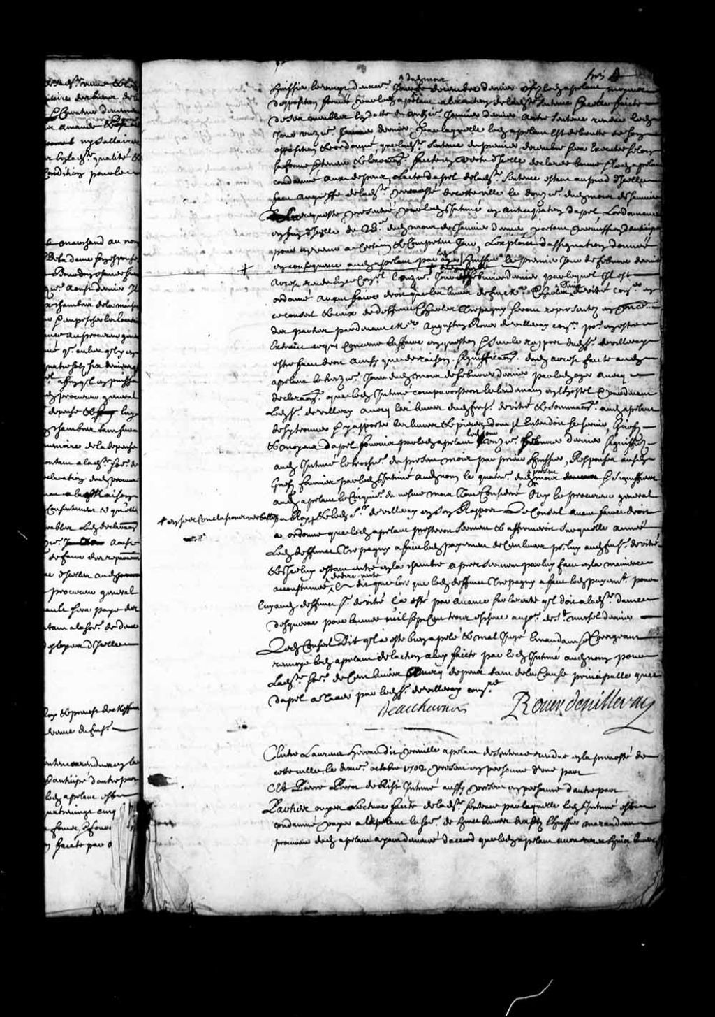 - Transcription du texte avec orthographe modernisée : «Entre Laurent HEREAU dit PREVILLE appelant de sentence rendue en la prévôté de cette ville le dixième octobre 1702 présent en personne d'une part et Pierre PERROT (Perrault) de RISI (Dérisy) intimé aussi présent en personne d'autre part. Parties ouïes. Lecture faite de ladite sentence par laquelle ledit intimé est condamné payer à l'appelant la somme de huit livres dix sols l'huissier Marandeau (Maranda) procureur dudit appelant ayant demeuré d'accord que ledit appelant avait reçu huit livres les dépens compensés sauf à l'appelant son recours pour la somme de vingt-cinq livres qu'il dit lui être due par le nommé Dubrocas (Dubroca) à l'encontre d'icelui ainsi qu'il avisera bon être, d'une promesse faite sous seing privé par ledit intimé audit appelant de lui payer ou à son ordre la somme de seize livres dix sols qu'il confesse lui devoir en date du vingt-cinquième octobre 1701: au pied de laquelle est une autre promesse dudit intimé de poursuivre ledit du Brocas pour ce qu'il devait audit appelant et après que lesdites parties sont convenues que ledit du Brocas pour les associés de l'intimé doit pour sa part des gages que l'appelant a gagnées à leur service la somme de vingt-cinq livres et que c'est ledit intimé qui a engagé ledit appelant ouï aussi le procureur général du Roi. Le Conseil dit qu'il a été mal jugé et bien appelé émendant et corrigeant condamne ledit Derisi intimé à payer audit appelant la somme de trente-trois livres dix sols et aux dépens tant de la cause principale que d'appel sauf le recours dudit intimé pour la somme de vingt-cinq livres à l'encontre dudit du Brocas ainsi qu'il avisera bon être. BEAUHARNOIS.»