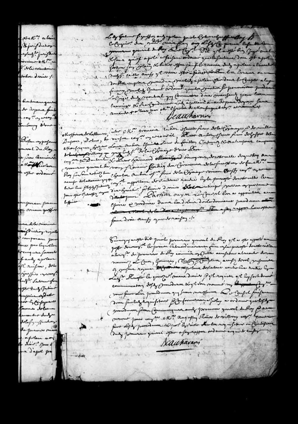 Arrêt appointant Olivier Morel de La Durantaye (LaDurantaye) commissaire, pour recevoir les plaidoyers dans l'appel institué contre François Aubert, sieur de la Chesnaye (LaChesnaye) et de Mille-Vaches, conseiller, Pierre Aubert, sieur de Gaspé, et Louis Aubert, sieur de Forillon, intimés, par Pierre Émard (Haimard), marchand de Québec, agissant comme syndic des créanciers de la succession de feu Charles Aubert, sieur de la Chesnaye (LaChesnaye),conseiller, et faire rapport, 7 avril 1704, Archives nationales à Québec, Fonds Conseil souverain, (03Q,TP1,S28,P7813).