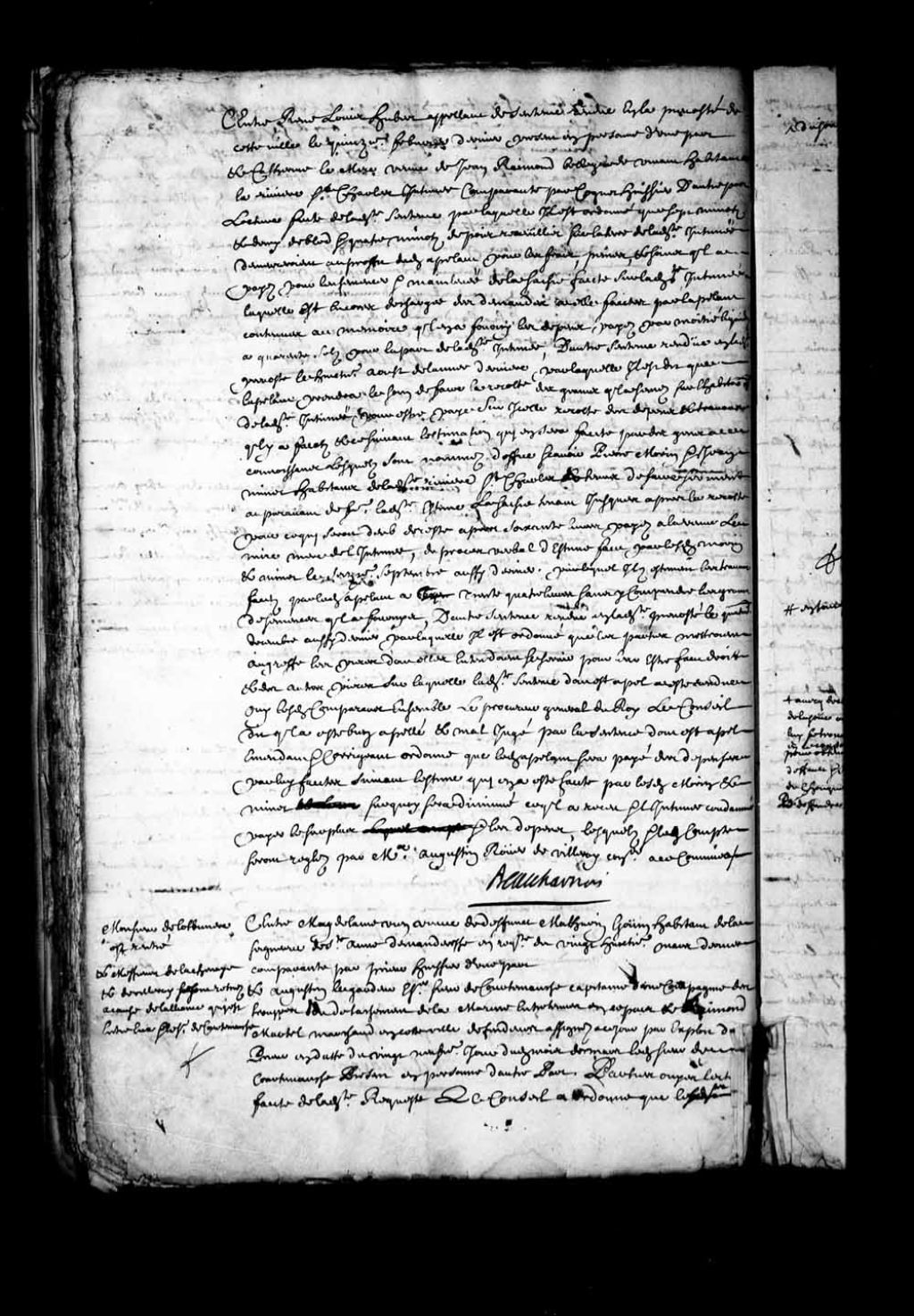 - Transcription du texte avec orthographe modernisée : «Entre René Louis HUBERT appelant de sentence rendue en la prévôté de cette ville le quinzième février dernier présent en personne d'une part et Catherine Lemire veuve de Jean Raymond Bellegarde vivant habitant à la rivière Saint-Charles intimée comparante par Cognet huissier d'autre part. Lecture faite de ladite sentence pour laquelle il est ordonné que sept minots et demi de blé et quatre minots de pois recueillis sur la terre de ladite intimée demeureraient au profit dudit appelant pour les frais, peines, et soins qu'il a payés pour l'ensemencer a mainlevée de la saisie faite sur ladite intimée laquelle est encore déchargée des demandes à elle faites par l'appelant contenues au mémoire qu'il en a fourni les dépens payes par moitié liquides à quarante sols pour la part de ladite intimée, d'autre sentence rendue en ladite prévôté le huitième août de l'année dernière par laquelle il est dit que l'appelant prendra le soin de faire la récolte des grains qu'il a semés sur l'habitation de ladite intimée pour être payé sur icelle récolte des dépens et travaux qu'il y a faits et ce suivant l'estimation qui en sera faite par des gens à ce connaissant lesquels sont nommes d'office savoir Pierre Morin et Jean Minet habitant de ladite rivière Saint-Charles et tenus de faire serment auparavant de faire ladite estime la saisie tenant jusque après la récolte pour ce qui serait dû de reste après soixante livres payés à la veuve Lemire mère de l'intimée, du procès-verbal d'estimation fait par lesdits morin et Minet le seizième septembre aussi dernier par lequel Ils estiment les travaux faits par ledit appelant à trente-quatre livres sans y comprendre les grains de semences qu'il a fournis, d'autre sentence rendue en ladite prévôté le quatrième décembre aussi dernier par laquelle il est ordonné que les parties mettraient au greffe les pièces dont elles entendaient se servir pour leur être fait droit et des autres pièces sur laquelle ladite sentence dont est appel a été rendue. Ouï lesdits comparants ensemble le procureur général du Roi. Le Conseil dit qu'il a été bien appelé et mal jugé par la sentence dont est appel émendant et corrigeant ordonne que ledit appelant sera payé des dépenses par lui faites suivant l'estime qui en a été faite par lesdits Morin et Minet sur quoi sera diminué ce qu'il a reçu et l'intimée condamnée payer le surplus et les dépens, lesquels et ledit compte seront réglés par maître Augustin Rouer de Villeray conseiller à ce commis. BEAUHARNOIS.»