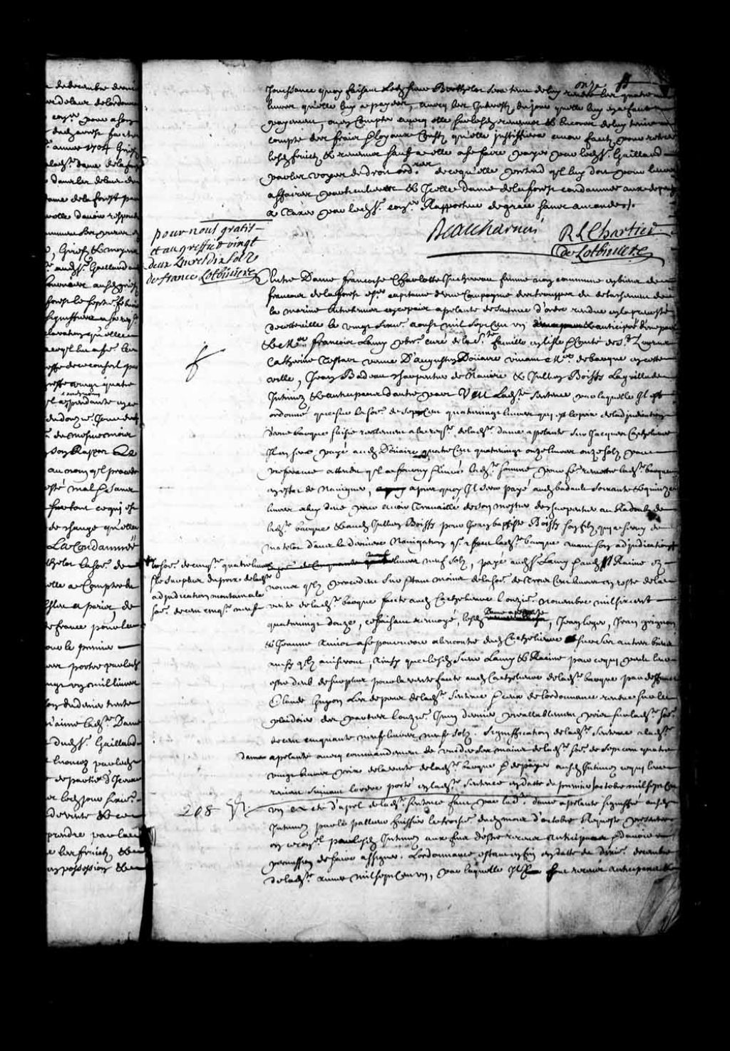 Transcription du texte avec orthographe modernisée : «Entre dame Françoise Charlotte JUCHEREAU femme non commune en biens de François de Laforest écuyer capitaine d'une compagnie des troupes du détachement de la marine entretenues en ce pays appelante de sentence d'ordre rendue en la prévôté de cette ville le vingt-sixième août mille sept cent un et anticipée d'une part et messire François LAMY prêtre curé de la Sainte-Famille en l'île et comté de Saint-Laurent Catherine Testart (Testard) veuve de Augustin Douaire vivant maître de barque en cette ville, Jean BADEAU charpentier de navire et Julien Boissy LAGRILLADE intimés et anticipans d'autre part vu ladite sentence par laquelle il est ordonné que sur la somme de sept cent quatre-vingt livres qui est le prix de l'adjudication d'une barque saisie réellement à la requête de ladite dame appelante sur Jacques Cachelieure (Cachelièvre) il en sera payé audit Douaire quatre cent quatre-vingt onze livres onze sols par préférence attendu qu'il a fourni et livré ladite somme pour faire remettre ladite barque en état de naviguer, après quoi il sera payé audit badeault soixante-quinze livres à lui due pour avoir travaillé de son métier de charpentier au radoub de ladite barque et audit Julien Boissy pour Jean-Baptiste Boissy son fils qui a servi de matelot dans la dernière navigation que a fait ladite barque avant son adjudication la somme de cinquante-quatre livres et le surplus du prix de ladite adjudication montant à la somme de cent cinquante-neuf livres neuf sols, payé audit sieur Lamy et audit Racine aux noms qu'ils procèdent sur et tant moins de la somme de trois cents livres en reste de la vente de ladite barque faite audit Cachelieure l'onzième novembre mille six cent quatre-vingt douze, ce faisant renvoyé, lesdits dame appelante, Jean Leger, Jean Grignon et Jeanne Amiot à se pourvoir à l'encontre dudit Cachelieure sur ses autres biens ainsi qu'ils aviseront, ainsi que lesdits sieurs Lamy et Racine pour ce qui peut leur être dû de surplus pour la vente faite audit Cachelieure de ladite barque par défunt Claude Guyon les dépens de ladite sentence et ceux de l'ordonnance rendue sur le plaidoyer des parties l'onzième juin dernier préalablement pris sur ladite somme de cent cinquante-neuf livres neuf sols signification de ladite sentence à ladite dame appelante avec commandement de vider ses mains de ladite somme de sept cent quatre-vingt livres prix de la vente de ladite barque et de payer auxdits intimés ce qui leur revient suivant l'ordre porté en ladite sentence en date du premier octobre mille sept cent un acte d'appel de ladite sentence fait par ladite dame appelante signifié auxdits intimés par Lepallieur (Lepailleur) huissier le troisième dudit mois d'octobre requête présentée en ce Conseil par lesdits intimés aux fins d'être reçus anticipans et d'avoir permission de faire assigner. L'ordonnance étant enfin en date du dixième décembre de ladite année mille sept cent un, par laquelle Ils sont reçus anticipans et à eux permis de faire assigner à jour certain et compétent, signification desdites requête et ordonnance avec assignation. à ladite dame appelante à comparaître en ce conseil pour procéder sur les fins de ladite requête en date dudit jour dixième décembre 1701 arrêt rendu en ce conseil le dix-neuvième du même mois par lequel les parties sont appointées à mettre les pièces dont elles entendent se servir sur le bureau pour ce fait être ordonné ce que de raison, signification dudit arrêt faite à ladite dame appelante à la requête desdits intimés le trentième jour de juillet dernier par Cognet huissier avec déclaration qu'ils se trouveront le lundi suivant en ce conseil aux fins de mettre les pièces dont Ils entendent se servir sur le bureau et sommation à ladite dame de faire le semblable si bon lui semble, autre déclaration faite à la requête desdits intimés à ladite dame appelante par Prieur huissier le vingt-septième jour de septembre aussi dernier qu'ils comparaîtront du lundi suivant en huitaine en ce conseil pour mettre sur le bureau les pièces qui concernent l'affaire qui est pendante entre eux en conformité de l'arrêt qui lui a été signifié ledit jour trentième juillet avec sommation à ladite dame appelante d'y comparaître et d'y satisfaire faute de quoi lesdits intimés requerront défaut à l'encontre d'elle. Défaut obtenu en ce Conseil par lesdits intimés le lundi huitième octobre aussi dernier signifié à ladite dame appelante par ledit Prieur huissier le quinzième dudit mois d'octobre. Déclaration faite à la requête desdits intimés à ladite dame appelante par ledit Prieur le sixième décembre aussi dernier que l'assignation à elle donnée le quinzième dudit mois d'octobre est continuée au lundi suivant dixième dudit mois avec sommation à ladite dame appelante d'y comparaître et défendre si bon lui semble, arrêt rendu en ce Conseil ledit jour dixième dudit mois de décembre par lequel sur ce que l'huissier Marandeau (Maranda) comparant pour ladite dame appelante a dit qu'elle n'a pu trouver les pièces qui regardent cette affaire elle demande délai pour les pouvoir trouver il lui est accordé délai pour les chercher jusqu'au lundi d'après la fête des Rois de la présente année après quoi serait fait droit, signification dudit arrêt faite à ladite dame appelante par ledit Prieur le vingt-quatrième dudit mois de décembre dernier avec assignation à elle en ce conseil audit jour du premier lundi d'après les Rois qui sera le septième jour de janvier pour voir prononcer sur la présente. Instance autre arrêt rendu en ce Conseil ledit jour septième janvier dernier par lequel lesdites parties sont appointées à mettre les pièces dont elles entendent se servir par-devant maître Charles de Monseignat conseiller pour à son rapport leur être fait droit signification dudit arrêt faite 