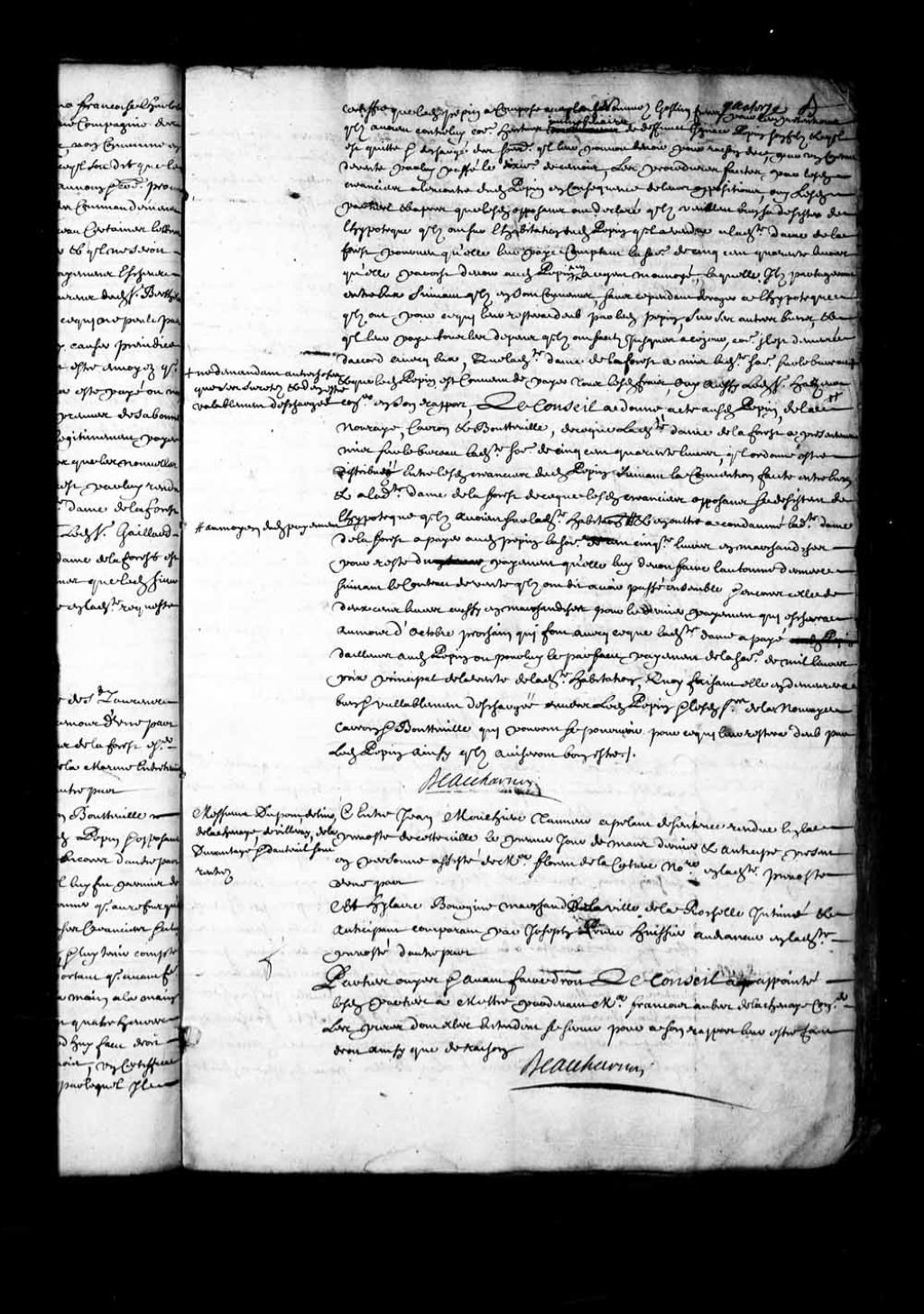 Transcription du texte avec orthographe modernisée : «Messieurs DuPont, Delino (De Lino) de Lachenaie de Villeray, de Ladurantaie (Ladurantaye) et d'Auteuil sont rentrés. Entre Jean MOUCHÈRE tanneur appelant de sentence rendue en la prévôté de cette ville le premier jour de mars dernier et anticipé présent en personne assisté de maître Florent de Lacetière notaire en ladite prévôté d'une part et Hilaire BOURGINE marchand de la ville de La Rochelle intimé et anticipant comparant par Joseph Prieur huissier audiencier en ladite prévôté d'autre part. Parties ouïes et avant faire droit le Conseil a appointé lesdites parties à mettre par-devant maître François Aubert de Lachenaie (Lachesnaye) conseiller les pièces dont elles entendent se servir pour à son rapport leur être fait droit ainsi que de raison. BEAUHARNOIS.»