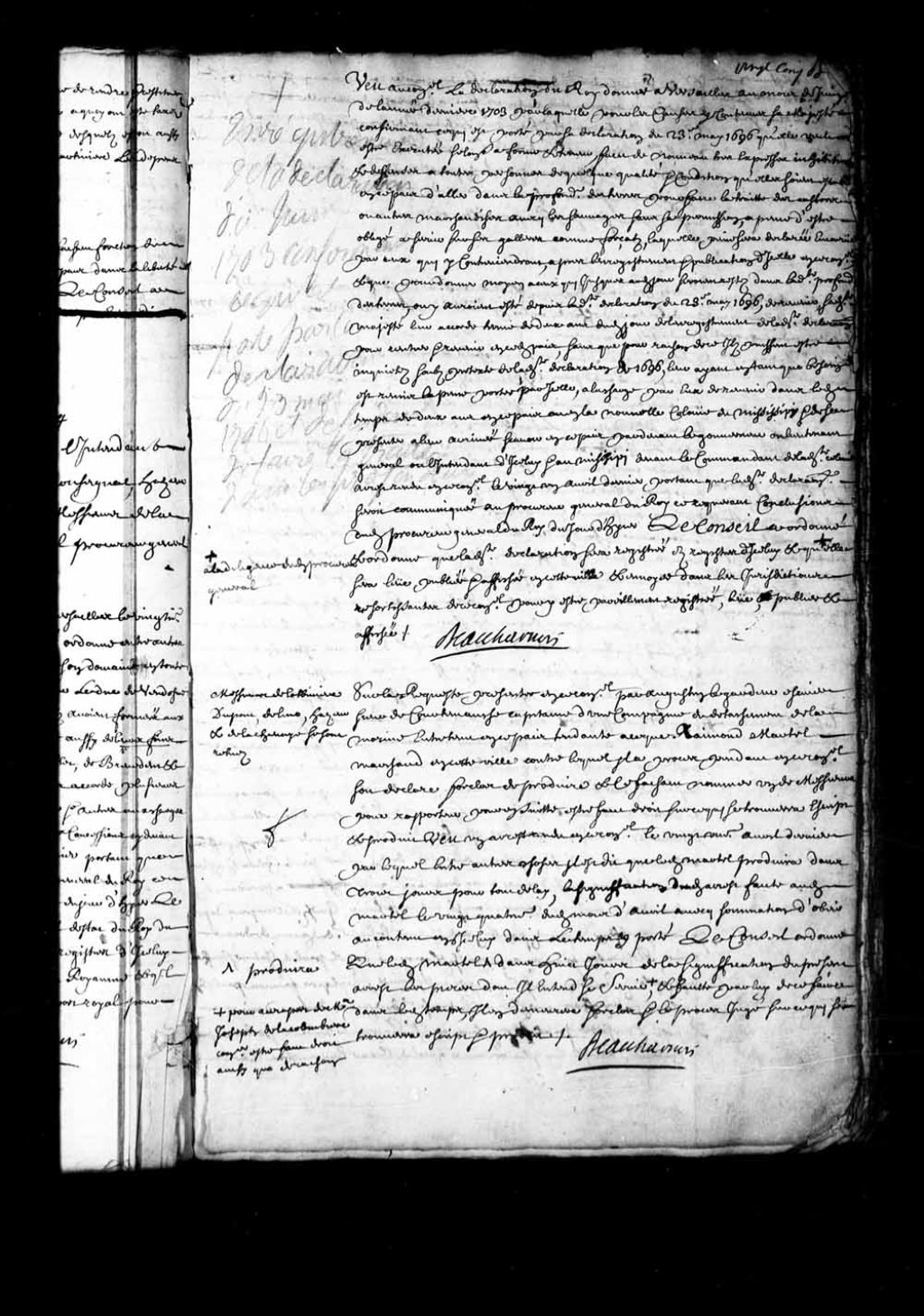 - Transcription du texte avec orthographe modernisée : «Vu au Conseil la déclaration du Roi donnée à Versailles au mois de juin de l'année dernière 1703 par laquelle pour les causes y contenues sa Majesté confirmant ce qui est porté par sa déclaration du 23e mai 1696 qu'elle veut être exécutée selon sa forme et teneur, fait de nouveau très expresses inhibitions et défenses à toutes personnes de quelque qualité et condition qu'elles soient établies en ce pays d'aller dans la profondeur des terres pour faire la traite des castors ou autres marchandises avec les Sauvages sans sa permission, à peine d'être obligé à servir sur ses galères comme forçats, laquelle peine sera déclarée encourue par ceux qui y contreviendront, après l'enregistrement et publication d'icelle en ce Conseil et que pour donner moyen à ceux qui jusqu'audit jour seraient restés dans ladite profondeur des terres, ou y auraient été depuis ladite déclaration du 23e mai 1696, de revenir, sa dite Majesté leur accorde terme de deux ans dudit jour de l'enregistrement de ladite déclaration pour rentrer et revenir en ce dit pays, sans que pour raison de ce Ils puissent être inquiétés sous prétexte de ladite déclaration de 1696, leur ayant en tant que besoin est remis la peine portée par icelle, à la charge par eux de revenir dans ledit temps de deux ans en ce pays ou en la nouvelle colonie de mississipi et de se présenter à leur arrivée savoir en ce pays par-devant le gouverneur ou lieutenant général ou l'intendant d'icelui et au Mississipi (Mississippi) devant le commandant de ladite colonie arrêt rendu en ce Conseil le vingt et un avril dernier portant que ladite déclaration serait communiquée au procureur général du Roi ce requérant conclusions dudit procureur général du Roi du jourd'hier, le Conseil a ordonné et ordonne que ladite déclaration sera registrée aux registres d'icelui et qu'à la diligence dudit procureur général elle sera lue publiée et affichée en cette ville et envoyée dans les juridictions ressortissantes de ce Conseil pour y être pareillement registrée, lue, publiée et affichée. BEAUHARNOIS..»