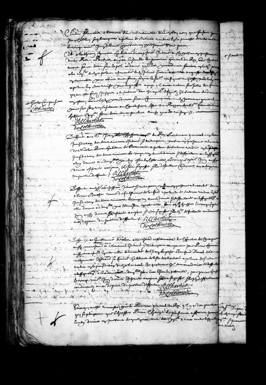 Transcription du texte avec orthographe modernisée : «Sur ce qui a été remontré par le procureur général du Roi qu'il y a des parties qui se plaignent que l'huissier Prieur chargé de plusieurs affaires promit lundi dernier en présence de quelques-uns du Conseil à ceux contre lesquels il avait des affaires qui ne purent être vidées ledit jour, de se trouver ce jourd'hui pour terminer lesdites affaires que cependant il n'y est pas venu, sachant bien que on ne pouvait obtenir contre lui aucun défaut n'y ayant aucune assignation ni avenir audit jour, ce qui fait un grand tort à ces personnes qui sont de Montréal et autres lieux éloignés et les faits souffrir beaucoup tant par la dépense qu'ils sont obligés de faire en cette ville que par les autres frais qu'il les oblige de faire à quoi il estime qu'il est nécessaire de remédier pourquoi il requiert qu'il soit enjoint audit Prieur de comparaître lundi prochain pour toute préfixion et délai en ce Conseil pour y plaider les cause dont il est chargé à peine d'être interdit de sa charge d'huissier, de ne plus occuper à l'avenir pour personne et d'être tenu des dépens dommages et intérêts des parties intéressées, le Conseil faisant droit sur ledit réquisitoire ordonne que ledit Prieur comparaîtra lundi prochain au Conseil pour plaider les causes dont il est chargé et pour lesquelles il avait promis de comparaître ce jourd'hui à peine d'interdiction de sa charge d'huissier et de ne plus servir de procureur pour personne à l'avenir. R. L. CHARTIER DE LOTBINIERE»