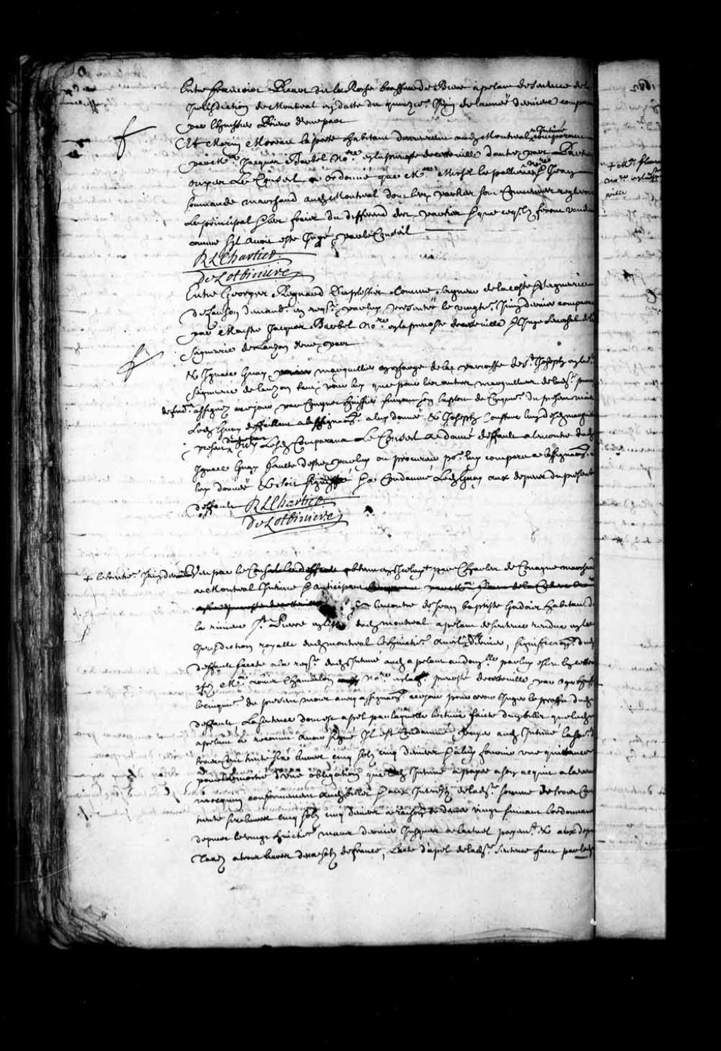 - Transcription du texte avec orthographe modernisée : «Vu par le Conseil le défaut obtenu en icelui le trentième juin dernier par Charles de Couagne marchand à Montréal intimé et anticipant à l'encontre de Jean-Baptiste Gadois habitants de la rivière Saint-Pierre en l'île dudit Montréal appelant de sentence rendue en la juridiction royale dudit Montréal le huitième avril aussi dernier, signification dudit défaut faite à la requête dudit intimé audit appelant au domicile par lui élu en cette ville chez messire Louis Chambalon notaire en la prévôté de cette ville par Oger huissier le cinquième du présent mois avec assignation à ce jour pour voir juger le profit dudit défaut, la sentence dont est appel par laquelle lecture faite d'un billet que ledit appelant a reconnu avoir signé il est condamné payer audit intimé la somme de trois cent trente-six livres cinq sols cinq deniers et à lui fournir une quittance pour la moitié d'une obligation que ledit intimé a payée à son acquit à la veuve Moquin conformément audit billet et aux intérêts de ladite somme de trois cent trente-six livres cinq sols cinq deniers à raison du denier vingt suivant l'ordonnance depuis le vingt-huitième mars dernier jusqu'à l'actuel payement et aux dépens taxes à trois livres deux sols de France, l'acte d'appel de ladite sentence fait par ledit appelant au greffe dudit Montréal ledit jour huitième avril dernier signifié le même jour audit intimé par Attenville huissier audit Montréal, la requête dudit intimé en anticipation dudit appel, l'ordonnance enfin d'icelle qui le reçoit anticipant en date du douzième dudit mois de juin dernier signification d'icelle audit appelant avec assignation à comparaître en ce Conseil ledit jour trentième juin dernier par exploit d'oger huissier en date du vingt et unième dudit mois de juin et après que maître Florent de Lacetière aussi notaire en ladite prévôté de cette ville comparant pour ledit intimé a requis le profit dudit défaut et que ledit Gadois n'a comparu ni procureur pour lui. Le Conseil en adjugeant le profit dudit défaut dit qu'il a été bien jugé mal et sans grief appelé ce faisant ordonne que la sentence dont est appel sortira son plein et entier effet et ci a condamné ledit appelant en l'amende pour son fol appel modérée à trois livres et aux dépens. R. L. CHARTIER DE LOTBINIERE»