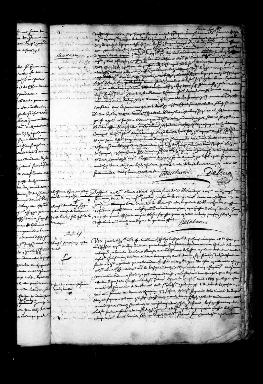 - Transcription du texte avec orthographe modernisée : «Monsieur de Villeray est rentré. Vu par le Conseil le défaut obtenu en icelui le septième du présent mois par maître Jean LeChasseur conseiller du Roi lieutenant général en la juridiction des Trois-Rivières intimé et anticipant à l'encontre de Marie Boucher veuve de Etienne de Lafont (Lafond) appelante de sentence rendue en ladite juridiction des Trois-Rivières le vingt et un avril dernier, signification dudit défaut faite à ladite appelante par Marandeau (Maranda) huissier au domicile par elle élu en cette ville chez maître Louis Chambalon notaire le dix-septième du présent mois avec assignation à ce jour pour voir ordonner sur ledit appel ce que de raison. La sentence dont est appel par laquelle attendu la paisible jouissance dudit sieur intimé depuis le vingtième avril 1683 qui lui a été accordé la seigneurie de la Rivière-du-Loup sans lui avoir été fait aucun trouble ladite appelante est déboutée de l'opposition par elle formée au décret volontaire qui se fait de ladite seigneurie de la Rivière-du-Loup et en conséquence ordonne qu'il sera passé outre audit décret et ladite appelante condamnée aux dépens taxés et endosés à neuf livres douze sols de France, la signification de ladite sentence faite à la requête dudit sieur intimé à ladite appelante par potier (Pothier) huissier ledit jour vingt et unième avril dernier, l'acte d'appel de ladite sentence fait par ladite appelante par-devant Potier notaire aux dites Trois-Rivières le cinquième mai aussi dernier contenant son élection de domicile en la maison dudit Chambalon, signifié audit sieur intimé le neuvième jour dudit mois de mai, requête dudit intimé en anticipation dudit appel, l'ordonnance enfin d'icelle qui le reçoit anticipant et lui permet de faire assigner pour en venir à certain et compétent jour en date du vingt-sixième dudit mois de mai dernier, signification desdites requête et ordonnance faite à ladite appelante au domicile par elle élu en cette dite ville chez ledit Chambalon par Oger huissier le vingt-septième juin aussi dernier avec assignation à comparaître en ce conseil du lundi suivant en huitaine et après que maître Jacques Barbel notaire en la prévôté de cette ville comparant pour ledit sieur intimé a requis le profit dudit défaut et que ladite appelante n'a comparu ni personne pour elle. Le Conseil dit qu'il a été bien jugé, mal et sans grief appelé ce faisant ordonne que la sentence dont est appel sortira son plein et entier effet et ci a condamné ladite appelante en l'amende pour son fol appel modérée à trois livres et aux dépens. BEAUHARNOIS.»
