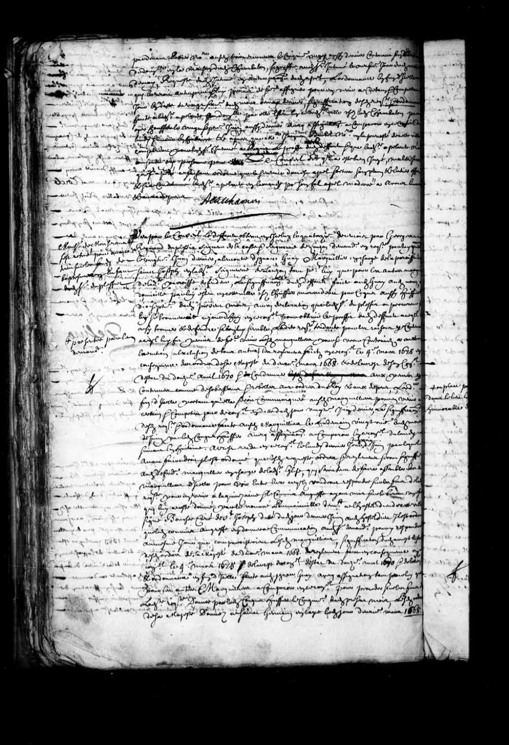 - Transcription du texte avec orthographe modernisée : «Monsieur de Monseignat s'est retiré pour avoir tenu sur les fonds du baptême un enfant dudit sieur Duplessis. Vu par le Conseil le défaut obtenu en icelui le quatorzième de ce mois par Georges Regnard Duplessis seigneur de la côte et seigneurie de Lauson (Lauzon) demandeur en requête par lui présentée le vingtième juin dernier, à l'encontre de Ignace Guay marguillier en charge de la paroisse de Saint-Joseph en ladite seigneurie de Lauson (Lauzon) , tant pour lui que pour les autres marguilliers de ladite paroisse défendeur, la signification dudit défaut faite audit Guay audit nom au domicile par lui élu en cette ville chez l'huissier Marandeau (Maranda) par Cognet aussi huissier le dix-septième dudit présent mois, avec déclaration que ledit sieur Duplessis ou procureur pour lui se trouverait ce jourd'hui en ce Conseil pour obtenir le profit dudit défaut à ce qu'il eût à s'y trouver et défendre si bon lui semble, ladite requête présentée par le demandeur tendante pour les raisons y contenues à ce qu'il lui fut permis de faire venir lesdits marguilliers pour se voir contraints à mettre a exécution a l'exclusion de tous autres les règlements faits en ce Conseil le 4e mars 1675 en conséquence des ordres de sa Majesté du deuxième mars 1668 et de l'arrêt de son Conseil d'état du douzième avril 1670 et condamner aux peines y contenues comme désobéissant et rebelles aux ordres du Roi et aux dépens, l'ordonnance enfin d'icelle portant qu'elle serait communiquée auxdits marguilliers pour en venir à certain et compétent jour de Conseil en date dudit jour vingtième juin dernier, la signification desdites requête et ordonnance faite auxdits marguilliers le lendemain vingt et unième dudit mois de juin par ledit Cougnet huissier avec assignation à comparaître en ce Conseil du lundi suivant en huitaine arrêt rendu en ce Conseil le lundi dernier jour dudit mois de juin par lequel avant faire droit qu'il est ordonné que lesdites requête, ordres et règlements seront signifiés audit défendeur marguillier en charge de ladite église, qui serait tenu de faire assembler les autres marguilliers d'icelle pour voir entre eux ce qu'ils voudront répondre sur les fins de ladite requête pour en venir à la quinzaine et le commis au greffe ayant mis sur le bureau un écrit qui lui a été donné par le nommé Pommainville (Pomainville) demeurant à l'Hôtel-Dieu de cette ville signé Boucher curé de Saint-Joseph daté dudit jour dernier juin audit Hôtel-Dieu il est ordonné que ledit commis au greffe en donnera communication audit sieur demandeur pour y répondre au même jour que comparaîtraient lesdits marguilliers, signification dudit arrêt ensemble desdits ordres de sa Majesté du deuxième mars 1668. du règlement fait en conséquence en ce Conseil le 4e mars 1675, de l'arrêt du Conseil d'état du douzième avril 1670 et de ladite requête et ordonnance enfin d'icelle faite audit Ignace Guay avec assignation tant pour lui que pour les autres marguilliers à comparaître en ce Conseil pour procéder sur les fins de ladite requête donnée par ledit Cougnet huissier le cinquième dudit présent mois, lesdits ordres de sa Majesté donnés à Saint-Germain en Laie ledit jour deuxième mars 1688 portant que dans toutes les processions et autres cérémonies qui se feront à l'avenir soit au-dedans ou au-dehors des églises tant cathédrales que paroissiales de ce pays Monsieur le gouverneur général ou le sieur gouverneur particulier de chaque lieu marchera le premier après lui les officiers de la justice et ensuite les marguilliers, sans que les officiers des troupes qui sont ou pourront être en ce dit pays puissent prétendre aucun rang dans lesdites processions et autres cérémonies publiques avec mandement au sieur lieutenant général de sa Majesté en ce dit pays, au sieur Talon intendant et à tous autres officiers qu'il appartiendra de tenir la main à l'exécution du présent règlement et à tous sujets et habitant de ce pays d'y obéir sous peine de punition, arrêt rendu en ce Conseil ledit jour quatrième mars mille six cent soixante-quinze par lequel il est ordonné que ledit ordre sera avec ledit arrêt lu publié et affiché de nouveau par toutes les paroisses, seigneuries et autres lieux nécessaires de ce dit pays afin que personne n'en puisse ignorer et que chacun aie à y obéir sous les peines y contenues et faisant droit sur le différent mis entre la justice de Montréal et Jean obuchon (Aubuchon) marguillier de la paroisse dudit Montréal, que sous les même peines les officiers de justice dudit lieu de Montréal, ainsi que de tous les autres lieux de ce dit pays auront après les gouverneurs et seigneurs un banc ou place particulière dans le lieu le plus honorable de chaque église et que lorsqu'ils se trouveront au service divin tant à jour ordinaire que extraordinaire Ils auront dorénavant, avant les marguilliers, le pain béni, la paix, encens, quête, cierges, rameaux et autres honneurs tant dedans que dehors l'église de leur lieu et après que messire Jacques Barbel notaire en la prévôté de cette ville et juge sénéchal de ladite côte de Lauson (Lauzon) comparant pour ledit sieur demandeur a requis le profit dudit défaut et les fins de ladite requête et que ledit Ignace Guay n'a comparu ni personne pour lui, le Conseil ouï le procureur général du Roi en adjugeant le profit dudit défaut ordonne que lesdits ordres de sa Majesté dudit jour deuxième mars 1668 et l'arrêt rendu en conséquence en ce Conseil ledit jour quatrième mars 1675 seront exécutés sous les peines y contenues selon leur forme et teneur et en ce faisant que les officiers de justice de ladite côte de Lauson (Lauzon) auront après le seigneur d'icelle un banc ou place particulière dans le lieu le plus honorable de ladite église de Saint-Joseph, et que lorsqu'ils se trouveront au servi