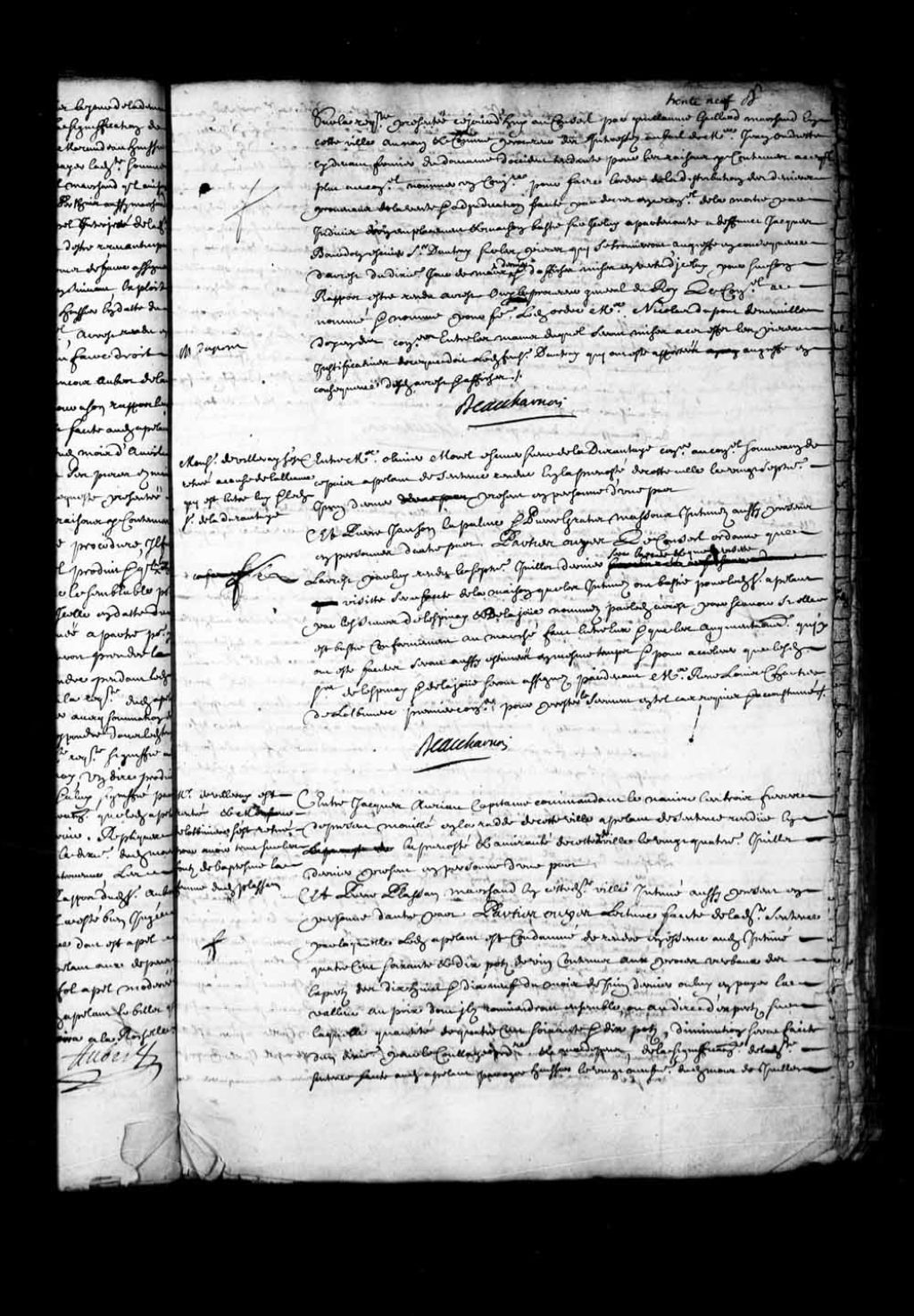 Transcription du texte avec orthographe modernisée : «Sur la requête présentée ce jourd'hui au Conseil par Guillaume Gaillard marchand en cette ville au nom et comme procureur des intéressés au bail de maître Jean Oudiette ci-devant fermier du domaine d'occident tendante pour les raisons y contenues à ce qu'il plût au Conseil nommer un commissaire pour faire l'ordre de la distribution des deniers provenant de la vente et adjudication faite par décret en ce Conseil de la moitié par indivis d'un emplacement et maison bâtie sur icelui appartenante a défunt Jacques Bourdon écuyer sieur Dautray (D'Autray) sur les pièces qui se trouveront au greffe en conséquence d'arrêt du dixième jour de mars dernier et d'affiches mises en vertu d'icelui pour sur son rapport être rendu arrêt. Ouï le procureur général du Roi. Le Conseil a nommé et nomme pour faire ledit ordre maître Nicolas Dupont de Neuville doyen des conseillers entre les mains duquel seront mises à cet effet ¿ N. Dupont ¿ les pièces justificatives de ce que doit ledit feu sieur Dautray qui ont été apportées au greffe en conséquence desdits arrêt et affiches. BEAUHARNOIS.»