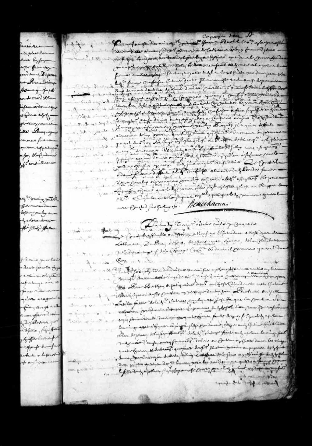 - Transcription du texte avec orthographe modernisée : «Du lundi treizième octobre mille sept cent quatre. Le Conseil assemblé où étaient Monsieur l'intendant Messieurs de Lotbinière, DuPont, Delino (De Lino) , de Monseignat, Hazeur, de la Colombière (Lacolombière) , de Ladurantaye et de Lachenaie (Lachesnaye) conseillers et d'Auteuil procureur général du Roi. Entre Joseph VENDENDAIQUE (Vandandaigue) menuisier appelant de sentence rendue en la prévôté de cette ville le vingt-deuxième août dernier présent en personne et anticipé d'une part et Pierre BERTHON apothicaire demeurant à l'Hôtel-Dieu de cette ville intimé et anticipant aussi présent en personne d'autre part. Parties ouïes. Lecture faite de ladite sentence par laquelle il est dit que les parties se retireront par-devant la mère supérieure dudit Hôtel-Dieu pour être réglées ce qui serait exécuté dans vingt-quatre heures faute de quoi faire par ledit appelant les vingt-quatre heures expirées il est condamné payer audit intimé huit livres et les dépens, de la signification de ladite sentence faite audit appelant le vingt-sixième dudit mois d'août avec sommation d'obéir au contenu en icelle dans les vingt-quatre heures et déclaration que faute de ce faire il serait contraint au payement desdites huit livres par les voies de droit, d'un certificat de la soeur apothicairesse dudit Hôtel-Dieu qu'elle a reçu douze livres pour les médicaments qu'elle a fourni pour la fille dudit appelant et qui lui ont été portés par ledit intimé en date du neuvième du présent mois le Conseil a mis l'appel et ce dont est appelé au néant et faisant droit à renvoyé ledit appelant de la demande à lui faite de huit livres par ledit intimé qui a été payée de ce qu'il a fait pour ladite fille de l'appelant et ledit intimé condamné aux dépens. BEAUHARNOIS.»