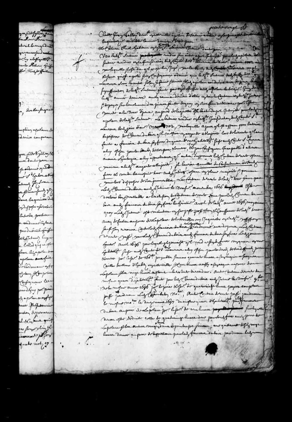 - Transcription du texte avec orthographe modernisée : «Entre Jean SALLOY (Salois) demeurant en cette ville appelant de sentence rendue en la prévôté de cette ville le quatorzième avril de l'année dernière d'une part. Et Clément RUEL habitant en l'île et comté Saint-Laurent intimé d'autre part. Vu ladite sentence rendue sur autre appel interjeté par ledit appelant de sentence rendue en la juridiction dudit comté de Saint-Laurent le dixième mars 1702 par laquelle il est dit qu'il a été bien jugé par le bailli dudit comté Saint-Laurent mal et sans grief appelé et en conséquence ordonné que ladite sentence dudit bailli de Saint-Laurent sera exécutée selon sa forme et teneur et ledit appelant condamné aux dépens, la signification de ladite sentence faite par Oger huissier audit appelant le treizième juin de ladite année dernière avec commandement d'obéir en tout le contenu en ladite sentence et de payer sur l'émolument des pièces faute de quoi en sera fait mémoire pour être procédé à la taxe d'iceux, au pied de laquelle est l'acte d'appel interjeté par ledit appelant de ladite sentence. La sentence rendue en ladite juridiction dudit comté Saint-Laurent ledit jour dixième mars 1702, par laquelle après qu'il est apparu par l'extrait baptistaire de Clément Dubois qu'il n'était en âge de majorité lors de la vente qu'il a faite à François Dubois son frère du quart d'une habitation sise audit comté Saint-Laurent à lui échu par le décès de ses père et mère, et par conséquent incapable d'aliéner aucuns héritages à lui appartenant, que au lieu d'approuver ledit contrat de vente étant parvenu à ladite âge de majorité, il l'aurait "annulé du consentement de sondit frère" et vendu la même terre audit intimé étant en pleine majorité et pouvant pour lors disposer de ses immeubles, le contrat de vente de ladite terre fait par ledit Clément Dubois audit intimé le troisième novembre 1696 est déclaré bon et valable a l'exclusion du contrat de vente fait par ledit Clément Dubois audit François Dubois son frère le huitième avril de ladite année 1696, moyennant quoi ledit intimé est maintenu en sa juste possession et jouissance de ladite terre avec défenses au père de l'appelant de le troubler ni inquiéter en sa dite possession sauf son recours contre ledit François Dubois, et ledit appelant condamné aux dépens, ledit contrat de vente passé par ledit Clément Dubois audit François Dubois son frère ledit jour huitième avril 1696 par lequel il paraît qu'il vend à sondit frère un quart et une habitation sise audit comté de Saint-Laurent à lui échu par le décès de ses défunts père et mère pour ladite somme de 160 livres payables savoir quarante livres à son acquit à Jacques Cailla tailleur d'habits en cette ville et cents livres aussi à son acquit au père de l'appelant et les vingt livres restant à la volonté du vendeur. Autre contrat de vente du même quart d'habitation faite par ledit Clément Dubois audit intimé le troisième novembre de la même année 1696 pour le prix et somme de quatre-vingt livres payées comptant passé par-devant ledit Chambalon notaire, autre contrat de vente passé par-devant le même notaire le douze mars 1697 du même quart d'habitation par ledit François Dubois au père de l'appelant pour la somme de cent livres sur laquelle devait être déduite celle de quatre-vingt livres due par sondit frère audit père de l'appelant et les autres vingt livres dans le printemps suivant, une quittance desdites vingt livres donnée au père de l'appelant par ledit François Dubois par-devant ledit notaire le trentième dudit mois de mars 1697, un extrait d'un acte passé par-devant ledit notaire le 26 août 1700 par lequel il paraît que ledit François Dubois remet audit intimé ledit Clément son frère présent le quart de l'habitation qu'il lui avait vendu attendu qu'il n'est nullement en état de payer le prix d'icelui cession passée par-devant ledit notaire le dix-huitième juillet 1701 audit appelant par sondit père dudit quart d'habitation moyennant ladite somme de cent livres que ledit appelant promet lui payer à sa volonté la requête présentée en ce Conseil par ledit appelant aux fins d'être reçu à l'appel par lui interjeté de ladite sentence de la prévôté de cette ville dudit jour quatorze avril de l'année dernière, l'ordonnance enfin d'icelle du quinzième janvier dernier par laquelle il est reçu à sondit appel et à lui permis de faire intimer pour en venir à certain et compétent jour, exploit d'assignation donnée en conséquence audit intimé par Marandeau (Maranda) huissier le dix-septième dudit mois de janvier, défaut obtenu en ce Conseil par ledit appelant à l'encontre dudit intimé le vingt-sixième dudit mois de janvier faute d'être par lui ou procureur pour lui ladite assignation signification dudit défaut faite audit intimé le dernier jour dudit mois de janvier par Dubreuil huissier en ce Conseil à ce que ledit intimé eut à se trouver en ce Conseil le lundi neuvième février ensuivant, arrêt rendu ledit jour neuvième février sur la comparution des parties qui les appointe à mettre les pièces dont elles entendent se servir par-devant maître Charles de Monseignat conseiller pour sur son rapport leur être fait droit, ainsi que de raison, signification dudit arrêt faite audit intimé par Marandeau (Maranda) huissier avec déclaration que ledit appelant a mis et produit entre les mains dudit sieur de Monseignat les pièces dont il entend se servir à ce que ledit intimé ou son procureur aient à faire le semblable toutes les autres pièces sur lesquelles lesdites sentences sont intervenues et tout considéré ouï maître François Aubert de Lachenaie (Lachesnaye) faisant fonction de procureur général du Roi en ses conclusions verbales et ledit sieur de Monseignat en son rapport, le Conseil dit qu'il a été bien appelé et mal jugé 