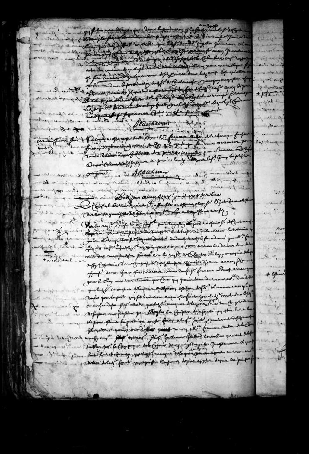 Transcription du texte avec orthographe modernisée : «Dudit jour vingt-septième avril 1705 de relevée. Le Conseil extraordinairement assemblé où étaient Monsieur l'intendant, Messieurs de Monseignat et de LaColombière conseillers les autres étant récusés. Vu la requête présentée au Conseil par Augustin Legardeur écuyer sieur de Courtemanche capitaine d'une compagnie des troupes du détachement de la marine entretenues en ce pays le vingt-troisième mars dernier tendante à ce qu'il fût ordonné que maître François Hazeur conseiller en ce Conseil resterait pour nommé pour recevoir les deniers tant de la vente des marchandises faite à Montréal à la requête de Charles Dalogny marquis de Lagrois (Lagroix) aussi capitaine d'une compagnie desdites troupes et major d'icelles au nom et comme ayant épousé dame Geneviève Maccart (Macard) veuve du feu sieur François Provost vivant gouverneur pour le Roi aux Trois-Rivières que ceux qui proviendront du [...]