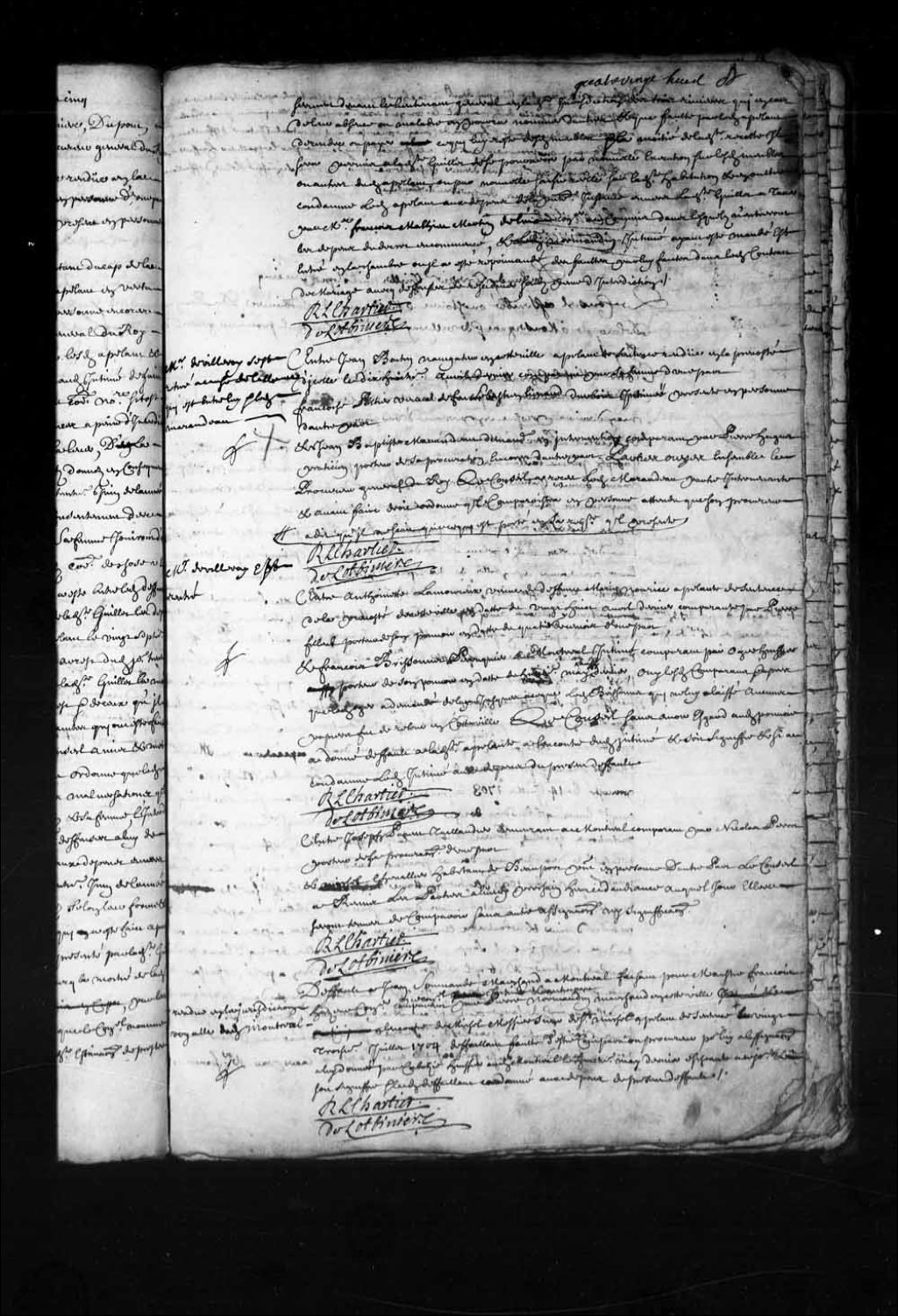 Transcription du texte avec orthographe modernisée : «Entre Joseph PARENT taillandier demeurant à Montréal comparant par Nicolas Perrot porteur de sa procuration d'une part et Michel CHEVALIER habitant de Beauport présent en personne d'autre Part, le Conseil a remis les parties à lundi prochain heure d'audience auquel jour elles seront tenues de comparaître sans autre assignation ni signification. R. L. CHARTIER DE LOTBINIERE.»