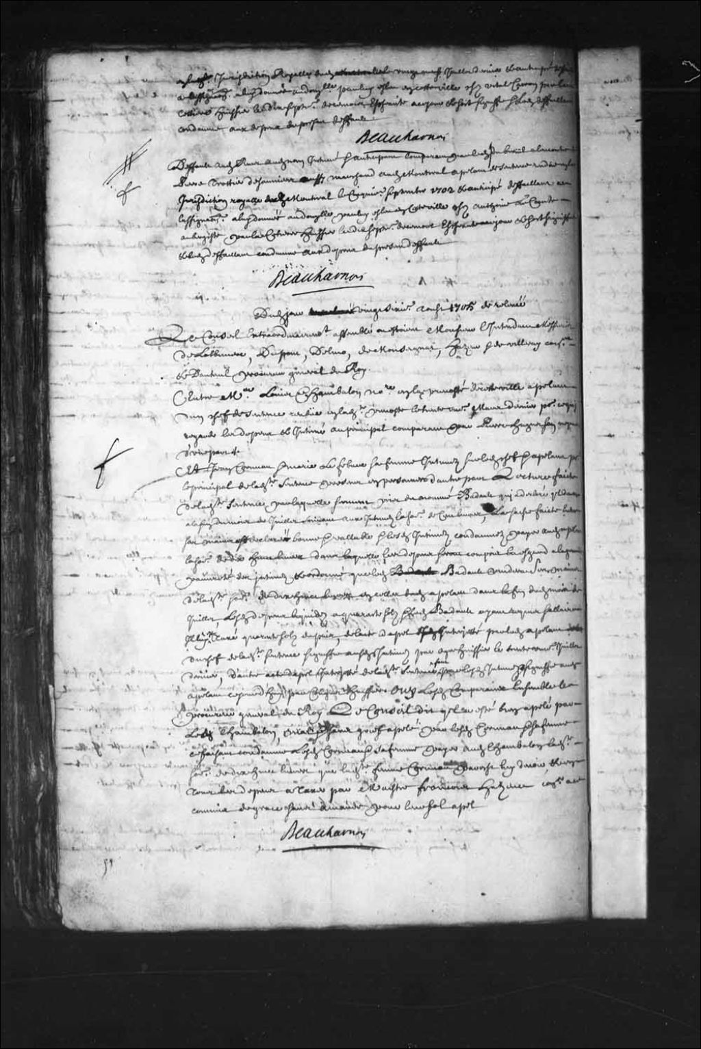 Transcription du texte avec orthographe modernisée : «Défaut audit Rivet audit nom intimé et anticipant comparant par ledit Dubreuil à l'encontre de Pierre Trottier Desauniers (Desaulniers) aussi marchand audit Montréal appelant de sentence rendue en la juridiction royale dudit Montréal le cinquième septembre 1702 et anticipé défaillant a l'assignation à lui donnée au domicile par lui élu en cette ville chez Antoine Lecomte aubergiste par LaCetière huissier le dix-septième de ce mois échéante à ce jour et soit signifié et ledit défaillant condamné aux dépens du présent défaut. BEAUHARNOIS.»