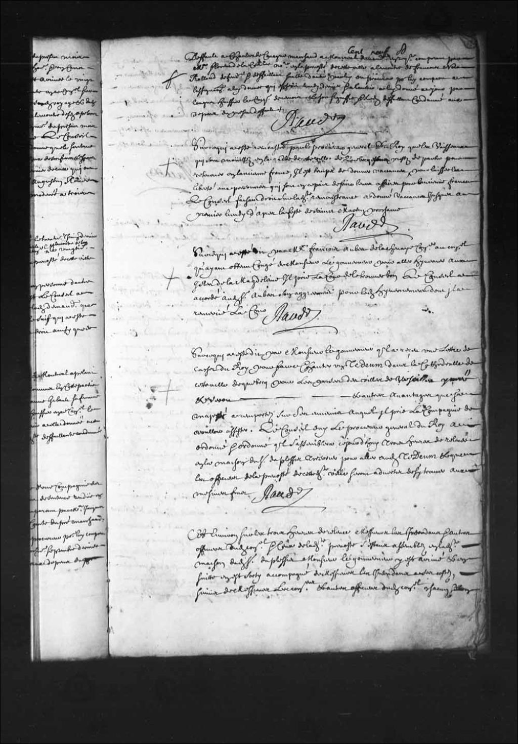 Transcription du texte avec orthographe modernisée : «Sur ce qui a été remontré par le procureur général du Roi que les vaisseaux qui sont mouillés en la rade de cette ville de Québec étant prêts de partir pour retourner en l'ancienne France, il est temps de donner vacances, pour laisser la liberté aux personnes qui sont en ce pays de faire leurs affaires pour l'ancienne France, le Conseil faisant droit sur ladite remontrance a donné vacances jusqu'au premier lundi d'après la fête de Saint-Martin prochaine. RAUDOT.»
