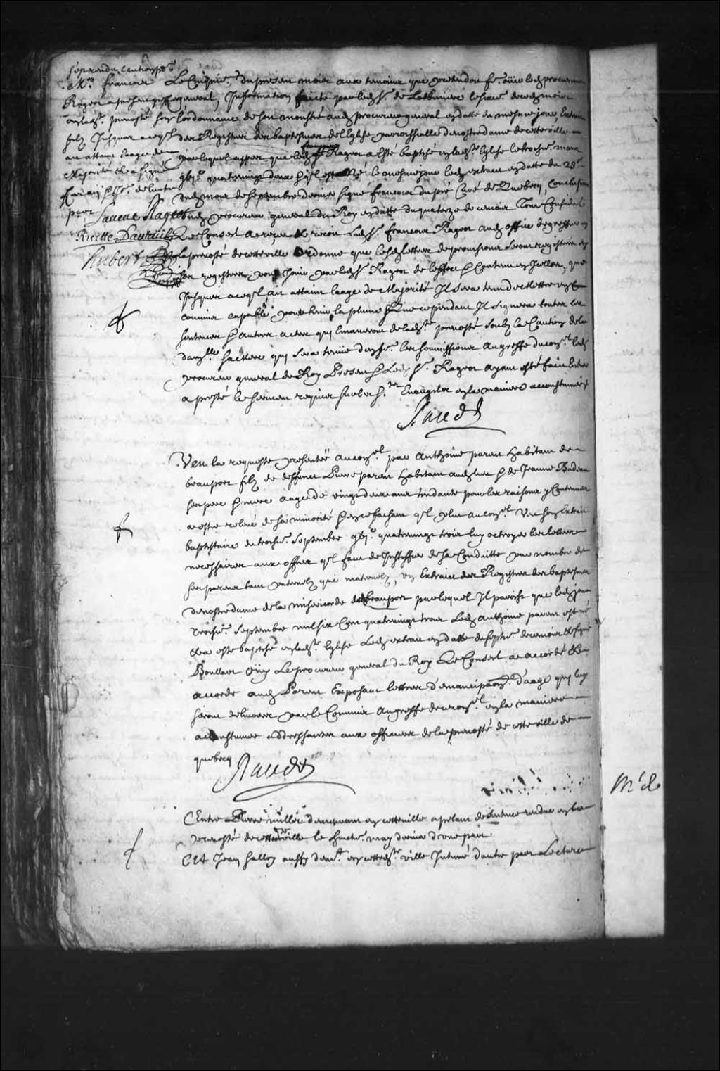 - Transcription du texte avec orthographe modernisée : «Vu la requête présentée au Conseil par Antoine parent habitant de Beauport fils de défunt Pierre parent habitant audit lieu et de Jeanne Badeau ses père et mère âge de vingt-deux ans tendante pour les raisons y contenues à être relevé de sa minorité et en ce faisant qu'il plût au Conseil vu son extrait baptistaire du troisième septembre mille six cent quatre-vingt-trois lui octroyer les lettres nécessaires aux offres qu'il fait de justifier de sa conduite par nombre de ses parents tant paternels que maternels, un extrait des registres des baptêmes de Notre-Dame de la miséricorde dudit Beauport par lequel il paraît que ledit jour troisième septembre mille six cent quatre-vingt-trois ledit Antoine parent est né et a été baptisé en ladite église ledit extrait en date du septième de ce mois et signé Boullart (Boulard) ouï le procureur général du Roi. Le Conseil a accordé et accorde audit [...]
