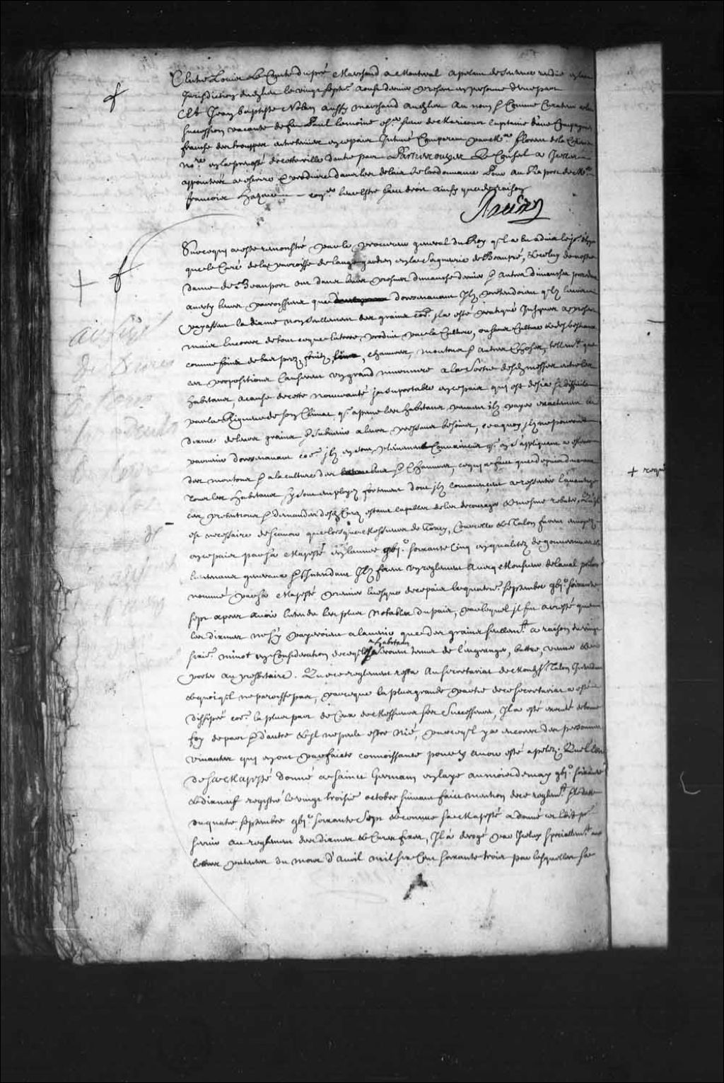 - Transcription du texte avec orthographe modernisée : «Sur ce qui a été remontré par le procureur général du Roi qu'il a eu avis le jourd'hier que le curé de la paroisse de L'Ange-Gardien en la seigneurie de Beaupré, et celui de Notre-Dame de Beauport ont dans leurs prônes dimanche dernier et autres dimanches précédents averti leurs paroissiens que dorénavant Ils prétendaient qu'ils leur payassent la dîme non seulement des grains comme il a été pratiqué jusqu'à présent mais encore de tout ce que la terre produit par la culture, ou sans culture et des bestiaux comme foins de bas près, fruits, lin, chanvres, moutons et autres choses, tellement que ces propositions causèrent un grand murmure à la sortie desdites messes entre les habitants, à cause de cette nouveauté insupportable en ce pays qui est déjà si difficile par la rigueur de son climat que à peine les habitants peuvent ils payer exactement la dîme de leurs grains et subvenir à leurs pressant besoins, ce à quoi ils ne pourront parvenir dorénavant comme ils en sont pleinement convaincus que en s'appliquant à élever des moutons et à la culture des lins et chanvres, ce qui a fait que depuis deux ans tous les habitants s'y sont employés fortement dont ils commencent à ressentir l'avantage ces prétentions et demandes desdits curés étant capables de les décourager et même rebuter. Qu'il est nécessaire de savoir que lorsque Messieurs de Tracy Courcelle et Talon furent envoyés en ce pays par sa Majesté en l'année mille six cent soixante-cinq en qualités de gouverneurs et lieutenants généraux et intendant Ils firent un règlement avec Monsieur de Laval pour lors nommé par sa Majesté premier évêque de ce pays le quatrième septembre mille six cent soixante-sept après avoir entendu les plus notables du pays, par lequel il fut arrêté que les dîmes ne s'y payeraient à l'avenir que des grains seulement à raison du vingt-sixième minot en considération de ce que les habitants seraient tenus de l'engranger, battre, vanner et porter au presbytère. Que ce règlement resta au secrétariat du mondit sieur Talon intendant et quoi qu'il ne paraisse pas parce que la plus grande partie de ce secrétariat a été dissipée comme la plupart de ceux de Messieurs ses successeurs (N.B. Allusion à des pertes d'archives) , il a été exécuté de bonne foi de part et d'autre et il ne peut-être nié, parce qu'il y a encore des personnes vivantes qui en ont parfaite connaissance pour y avoir été appelez. Que l'édit de sa Majesté donné à Saint-Germain en Laie au mois de mai mille six cent soixante-dix-neuf registré le vingt-troisième octobre suivant fait mention de ce règlement et le date du quatre septembre mille six cent soixante-sept et comme sa Majesté a donné cet édit pour servir au règlement des dîmes et cures fixes, il a dérogé par icelui spécialement aux lettres patentes du mois d'avril mille six cent soixante-trois par lesquelles sa Majesté avait confirmé le décret d'érection du séminaire de cette ville auquel il avait affecté toutes les dîmes de quelque nature qu'elles pussent être, dérogeant pareillement à toutes lettres patentes, édits et déclarations. Et autres actes contraires que lorsque sa Majesté fit connaître ses intentions par ses lettres à feu Monsieur le comte de Frontenac lors gouverneur général et à feu Monsieur Duchesneau intendant au sujet de l'établissement des cures fixes en ce pays et qu'elles furent réitérées et renouvelées par les lettres de feu Monsieur Colbert, Ils eurent ordre de régler dans une assemblée à quelle somme serait fixée la portion congrue de chaque curé et elle la fut à cinq cents livres outre les menus profits du dedans de l'église et on estime que avec cette somme, outre leur subsistance et entretien Ils pourraient avoir un domestique pour les servir. Que quoi que ce règlement soit suffisant et qu'il soit assuré que le moyen d'établir la paix ce serait de rendre toutes les cures fixes, cependant il n'y en a quasi pas et encore on en a pourvu que ceux que on est assuré qui rendront leurs provisions toutefois et quantes que on leur demandera et c'est pour cela que jusqu'à présent Ils n'ont pas faits enregistrer leursdites provisions et qu'ils les tiennent secrètes et aussi qu'ils ne s'attachent pas à l'augmentation du temporel desdites cures; qu'il est incontestable que par le partage qui a été fait pour l'étendue de chaque cure ou mission, il y en a peu qui n'ait plus que la portion réglée congrue, par les dîmes des grains seulement comme elles se sont perçues jusqu'à présent, et que quelque changement que on voulut y faire, ce ne serait que pour donner du superflu aux curés à la charge des peuples, et comme ces publications desdits curés sont une entreprise contre l'autorité séculière, il est d'importance d'en empêcher la continuation et les inconvénients qui en pourraient résulter c'est pourquoi ledit procureur général du Roi requiert que après s'être fait représenter l'édit de sa Majesté du mois de mai mille six cent soixante-dix-neuf et les lettres patentes du mois d'avril mille six cent soixante-trois, il soit ordonné que lesdits sieurs curés de L'Ange-Gardien et de Beauport viendront en personne rendre compte au Conseil de quelle autorité ils ont fait ladite publication, pour sur leurs réponses être par lui pris telles conclusions qu'il appartiendra et que cependant il soit fait défenses auxdits curés de L'Ange-Gardien et de Beauport et à tous autres de faire aucune publication pour innover dans la conduite que on a tenu jusqu'à présent dans le payement des dîmes et à tous les habitants de ce pays de payer d'autres dîmes que celles des blés et de toute sorte de grains comme il s'est pratiqué depuis ce temps la jusqu'à présent sous telle peine qu'il appartiendra. Le Conseil faisant droit sur lesdits remontrance et réquisitoire vu l'édit de sa Majesté du 