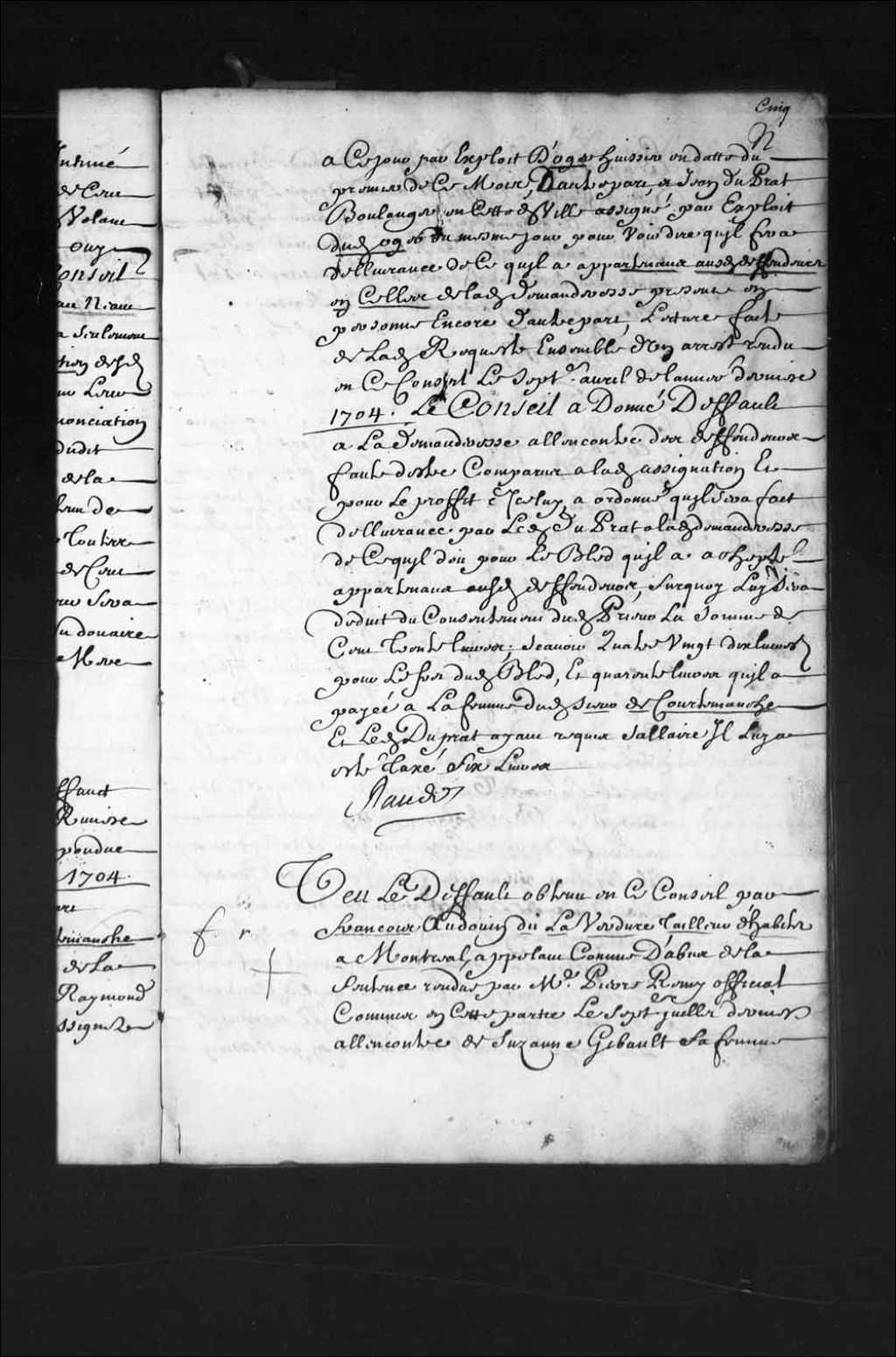 Ordre de communiquer au procureur général du Roi, les pièces du procès dans la cause de François Audoin dit Laverdure, tailleur d'habit de Montréal, contre Susanne Gibault, son épouse, 7 décembre 1705, Archives nationales à Québec, Fonds Conseil souverain, (03Q,TP1,S28,P8187).