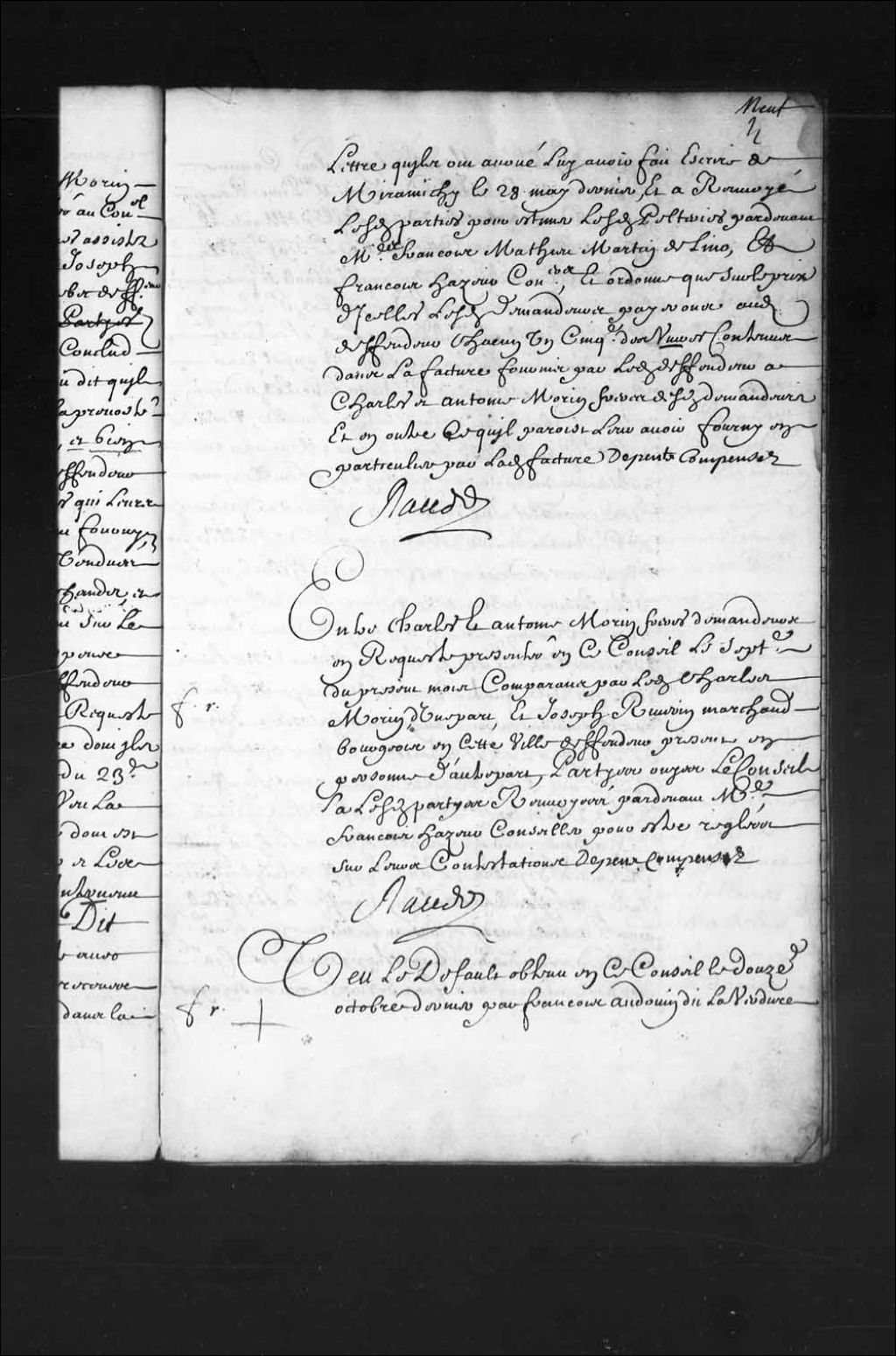 - Transcription du texte avec orthographe modernisée : «Vu le défaut obtenu en ce Conseil le douze octobre dernier par François Audoin dit LaVerdure tailleur d'habits à Montréal appelant, comme d'abus de la sentence rendue par messire Pierre Rémye (Rémy) prêtre curé de Lachine dans l'île de Montréal official commis en cette partie le septième juillet dernier, à l'encontre de Suzanne Gibault sa femme, toutes les procédures faites par ledit sieur Rémye sur lesquelles ladite sentence est intervenue, la sentence dont est appel par laquelle le mariage contracté entre ledit Audoin et ladite Gibault est déclaré nul et invalide, permis à ladite Gibault de se pourvoir par mariage ou autrement ainsi et avec qui bon lui semblera, avec les expresses inhibitions et défenses audit Audouin de contracter d'autre mariage à peine de nullité d'inquiéter médire ni ne faire à ladite Gibault, ni la plus traiter du tout de sa femme sous telle peine que de raison, et ledit Audoin condamné aux dépens, taxés à la somme de soixante-six livres dix-sept sols quatre deniers monnaie de France avec commandement au premier huissier ou sergent de signifier ladite sentence, et de faire en conséquence tout ce qui sera requis et nécessaire, signification de ladite sentence faite à la requête de ladite Gibault audit Audouin par hattenville (Hatanville) huissier le huitième dudit mois de juillet, l'acte d'appel de ladite sentence interjeté par ledit Audouin signifié à ladite Gibault par Pruneau aussi huissier le même jour huitième juillet dernier, la requête présentée en ce Conseil par ledit Audouin aux fins d'être reçu en son appel comme d'abus de ladite sentence, à ce qu'il lui fut permis de faire assigner ladite Gibault et qui bon lui semblerait pour procéder sur ledit appel comme d'abus, et ordonner que toutes les procédures faites à l'encontre de lui par ledit sieur Rémye soient incessamment envoyées au greffe de ce Conseil par le greffier de la commission dudit sieur Rémy avec défenses cependant à ladite Gibault de contracter mariage avec aucune personne sous telle peine qu'il plairait à la Cour de régler; arrêt rendu sur ladite requête le dix-septième jour d'août aussi dernier, par lequel ledit Audouin est reçu en l'appel comme d'abus, par lui interjeté de ladite sentence, à lui permis d'instruire ladite Gibault sa femme à comparaître en ce Conseil par elle-même et non par procureur, pour procéder sur ledit appel comme d'abus et cependant défenses à elle de contracter aucun mariage avec autre personne, et à tous prêtres et ecclésiastiques d'en célébrer aucun entre elle et qui que ce soit à peine de nullité et de tous dépens dommages et intérêts jusqu'à ce qu'il en ait été autrement ordonné, et enjoint à celui qui a servi de greffier audit sieur Rémy de délivrer audit Audouin copie de toutes les pièces sur lesquelles ladite sentence est intervenue en le payant de son salaire raisonnable, signification dudit arrêt et de ladite requête à ladite Gibault par Lepallieur (Lepailleur) huissier en ce Conseil le vingt-huitième dudit mois d'août avec assignation à elle de comparaître en ce Conseil le cinquième octobre aussi dernier, autre signification dudit arrêt faite à messire François Vachon de Belmont supérieur des ecclésiastiques du séminaire dudit Montréal à messire Yves Priat prêtre curé de la paroisse de Notre-Dame de Ville-Marie et à maître Pierre Raimbault greffier de la commission dudit sieur Rémy faite à la requête dudit Audouin par ledit Lepallieur (Lepailleur) le 29e dudit mois d'août dernier, la signification du défaut obtenu par ledit Audouin à l'encontre de ladite Gibault ledit jour douze octobre dernier, à elle faite par ledit Lepallieur (Lepailleur) le 24 du même mois d'octobre, avec déclaration que ledit Audouin se trouverait le lundi trentième novembre suivant au Conseil pour faire adjuger le profit dudit défaut, autre signification faite à la requête dudit Audouin à ladite Gibault par ledit Lepallieur (Lepailleur) le dixième dudit mois de novembre dernier, que ledit Audouin se trouverait au Conseil le lundi septième du présent mois pour obtenir le profit dudit défaut attendu que la fête de Saint-André échoit audit jour trente novembre dernier; arrêt rendu en ce Conseil ledit jour septième de ce mois par lequel avant d'adjuger le profit dudit défaut il est ordonné que toutes les pièces du procès seront communiquées au procureur général du Roi pour sur ses conclusions ou réquisitoire être ce jourd'hui ordonné ce que de raison, conclusions dudit procureur général du Roi et tout considéré, le Conseil en adjugeant le profit dudit défaut, dit qu'il a été bien appelé mal nullement et abusivement procédé par les sieurs de LaColombière et Rémye et en ce faisant a mis et met la sentence dont est appel au néant, ordonne que ladite Gibault retournera habiter avec ledit Audouin avec lequel elle vivra comme une femme doit vivre avec son mari, fait défenses à toutes personnes de quelque qualité et condition qu'ils soient de retirer ladite Gibault sous peine de cent livres d'amende applicable moitié audit Audouin et l'autre moitié à l'hôpital du lieu où ils feront leur demeure, a permis et permet audit Audouin de recouvrer reprendre et enlever tous les meubles et hardes que ladite Gibault a emporté ou fait emporter de chez lui, en quelque lieu qu'ils aient été remis et déposés, et a condamné ladite Gibault en toutes les dépens du procès à taxer par maître Delino (De Lino) conseiller à ce commis. RAUDOT.»