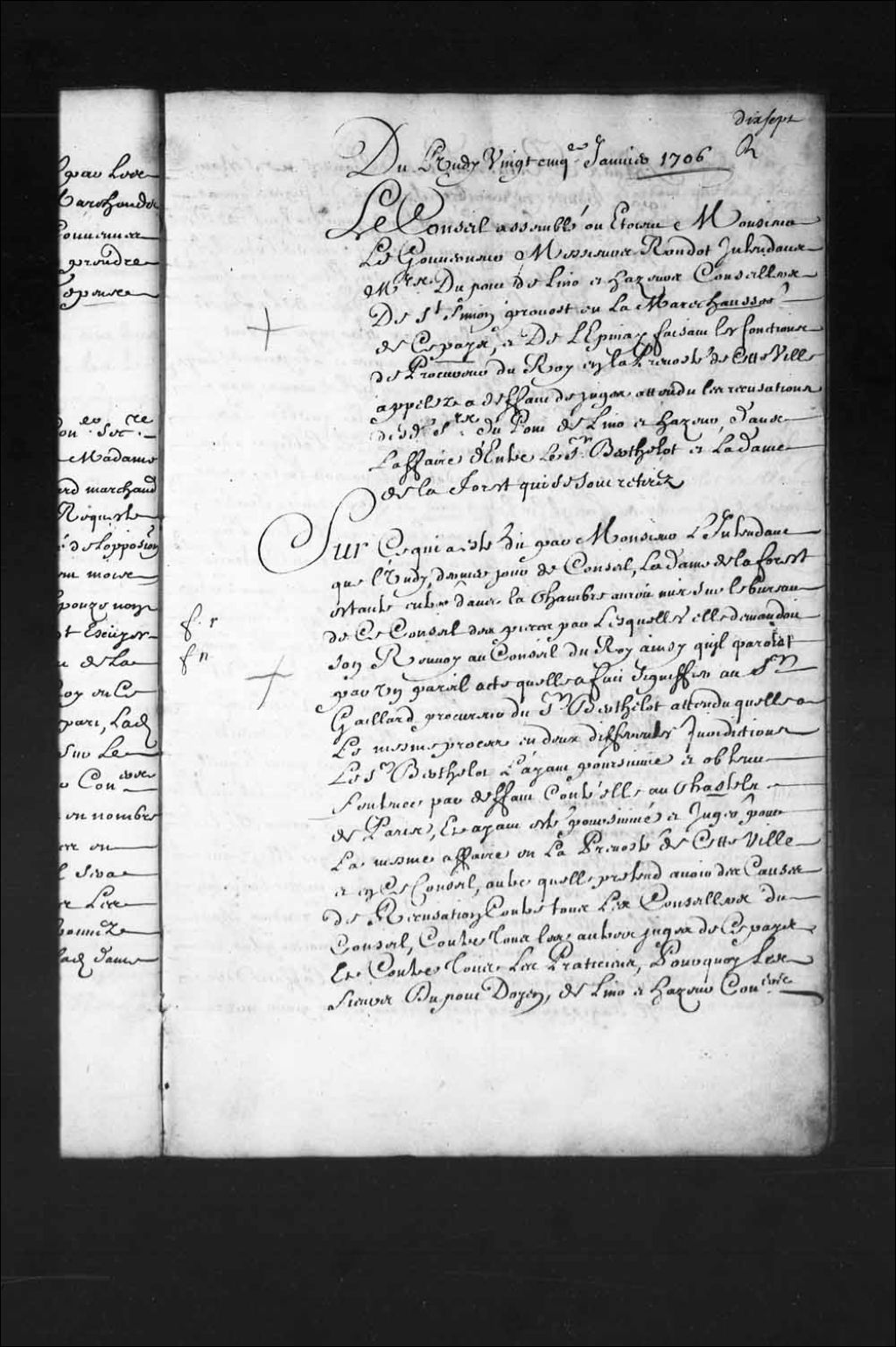 - Transcription du texte avec orthographe modernisée : «Du lundi vingt-cinquième janvier 1706. Le Conseil assemblé où étaient Monsieur le gouverneur Messieurs Raudot intendant Messieurs Dupont Delino (De Lino) et Hazeur conseillers de Saint-Simon Provost en la maréchaussée de ce pays, et de Lepinay faisant les fonctions de procureur du Roi en la prévôté de cette ville appelés à défaut de juges attendu les récusations desdits sieurs duPont Delino (De Lino) et Hazeur, dans l'affaire d'entre le sieur Berthelot et la dame de Laforest qui se sont retirés. Sur ce qui a été dit par Monsieur l'intendant que lundi dernier jour de Conseil, la dame de Laforest étant entrée dans la chambre aurait mis sur le bureau de ce Conseil des pièces par lesquelles elle demandait son renvoi au Conseil du Roi ainsi qu'il paraît par un pareil acte qu'elle a fait signifier au sieur Gaillard procureur du sieur Berthelot attendu qu'elle a le même procès en deux [...]
