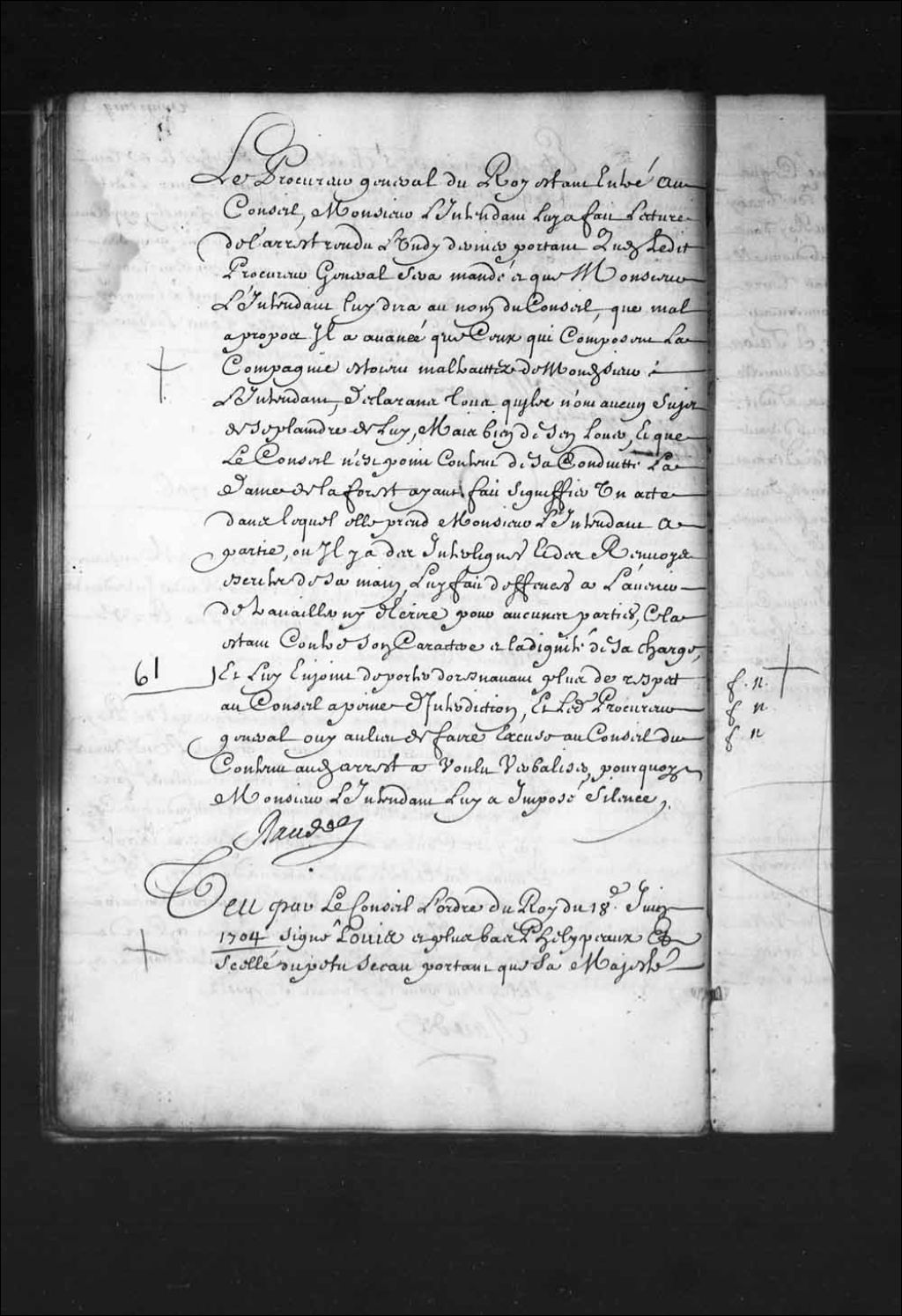 - Transcription du texte avec orthographe modernisée : «Vu par le Conseil l'ordre du Roi du 18e juin 1704 signé Louis et plus bas Phelypeaux et scellé du petit sceau portant que sa Majesté ayant été informée que l'on ne suit pas dans ce Conseil les usages usités dans le royaume dans la manière d'administrer la justice, mande et ordonne à Monsieur le marquis de Vaudreuil gouverneur et son lieutenant général en ce pays, au sieur de Beauharnois pour lors intendant de justice police et finances audit pays, et aux officiers de ce Conseil de tenir la main à l'exécution dudit ordre, le Conseil a ordonné qu'il sera communiqué au procureur général du Roi pour ensuite être ordonné ce que de raison. RAUDOT.»