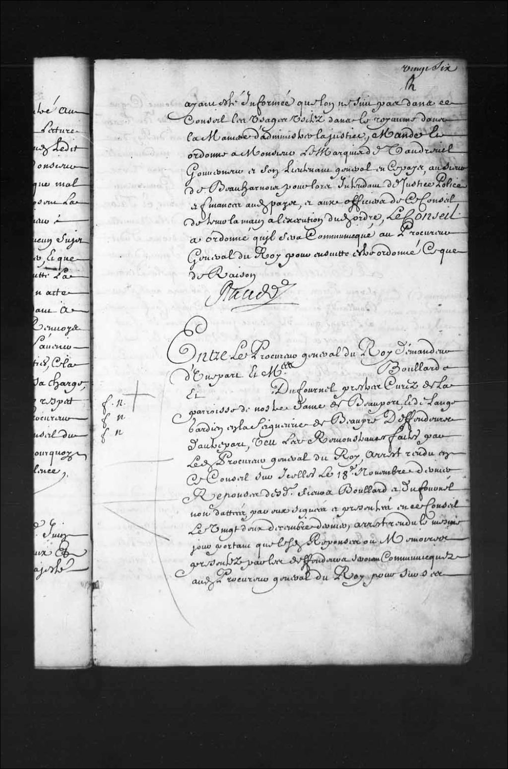 - Transcription du texte avec orthographe modernisée : «Entre le procureur général du Roi demandeur d'une part. Et maîtres Etienne BOULLARD (Boulard) et Gaspard DUFOURNEL prêtre curés de la paroisse de Notre-Dame de Beauport, et de L'Ange-Gardien en la seigneurie de Beaupré défendeurs d'autre part, Vu les remontrances faites par ledit procureur général du Roi, arrêt rendu en ce Conseil sur icelles le 18e novembre dernier, réponses desdits sieurs Boullard et Dufournel non datées par eux signées et présentées en ce Conseil le vingt-deux décembre dernier, arrêt rendu le même jour portant que lesdites réponses ou mémoires présentés par les défendeurs seront communiqués audit procureur général du Roi pour sur ses conclusions ou réquisitoire être ordonné ce que de raison, copie sur une copie collationnée d'une ordonnance faite par Messieurs de Tracy pour lors lieutenant général des armées du Roi dans les îles et terre ferme de l'Amérique [...]