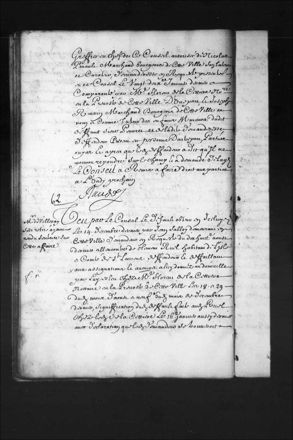 - Transcription du texte avec orthographe modernisée : «Maître de Villeray s'est retiré ayant rendu sentence sur cette affaire. Vu par le Conseil le défaut obtenu en icelui le 14 décembre dernier par Jean Salloy demeurant en cette ville demandeur en requête du dix-huitième août dernier à l'encontre de Clément Ruel habitant de l'île et comté de Saint-Laurent défendeur et défaillant aux assignations et avenirs à lui donnés au domicile par lui élu chez maître Florent de LaCettière notaire en la prévôté de cette ville les 18 et 19 dudit mois d'août et neuvième dudit mois de décembre dernier, signification dudit défaut faite audit Ruel chez ledit de LaCettière le 16e janvier aussi dernier avec déclaration que ledit demandeur se trouverait du lundi suivant en huit jours en ce Conseil pour obtenir le profit dudit défaut à ce qu'il eût à s'y trouver si bon lui semble ou procureur pour lui, autre déclaration faite à la requête dudit Salloy audit [...]