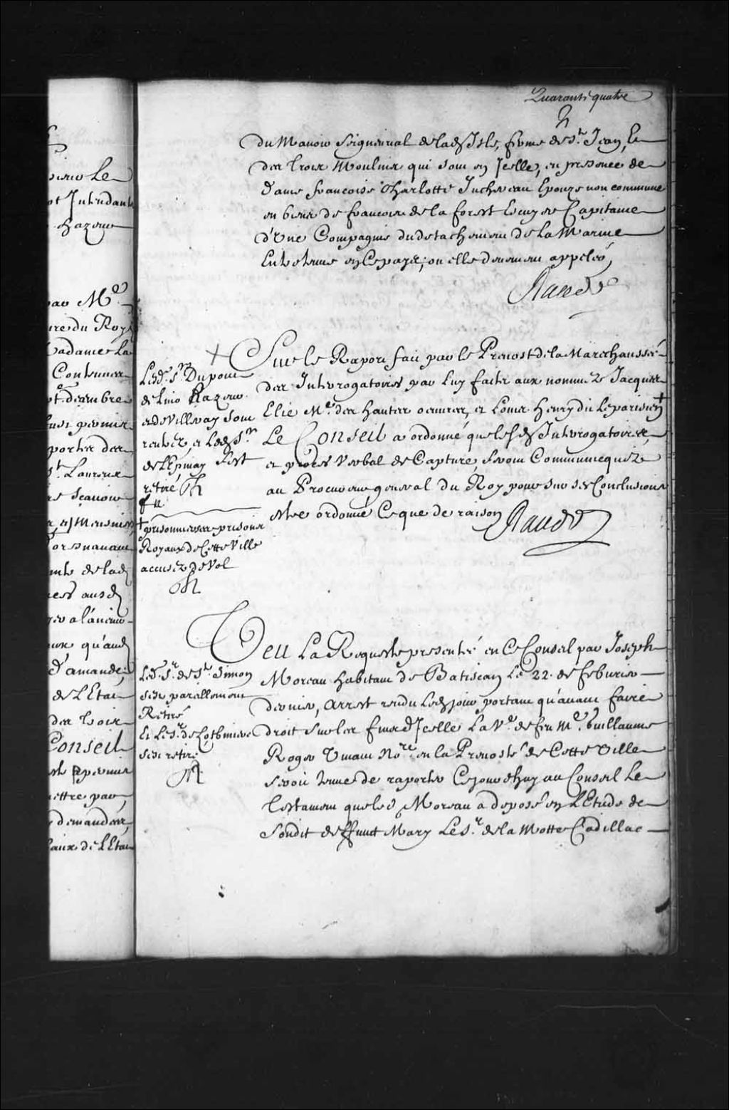 - Transcription du texte avec orthographe modernisée : «Ledit sieur de Saint-Simon s'est pareillement retiré et le sieur de Lotbinière s'est retiré. Vu la requête présentée en ce Conseil par Joseph Moreau habitant de Batiscan le 22 de février dernier, arrêt rendu ledit jour portant qu'avant faire droit sur les fins d'icelle la veuve de feu maître Guillaume Roger vivant notaire en la prévôté de cette ville serait tenue de rapporter ce jourd'hui au Conseil le testament que ledit Moreau a déposé en l'étude de sondit défunt mari le sieur de LaMotte Cadillac capitaine du détachement de la marine dûment appelé et en payant ladite veuve Roger de salaires raisonnables, signification dudit arrêt à ladite veuve Roger et audit sieur de LaMothe Cadillac en date du 25 du mois de février dernier, et après qu'il a été apporté au Conseil par Jourdain LaJus chirurgien en cette ville gendre de ladite veuve Roger, un paquet cacheté de cinq cachets sur [...]