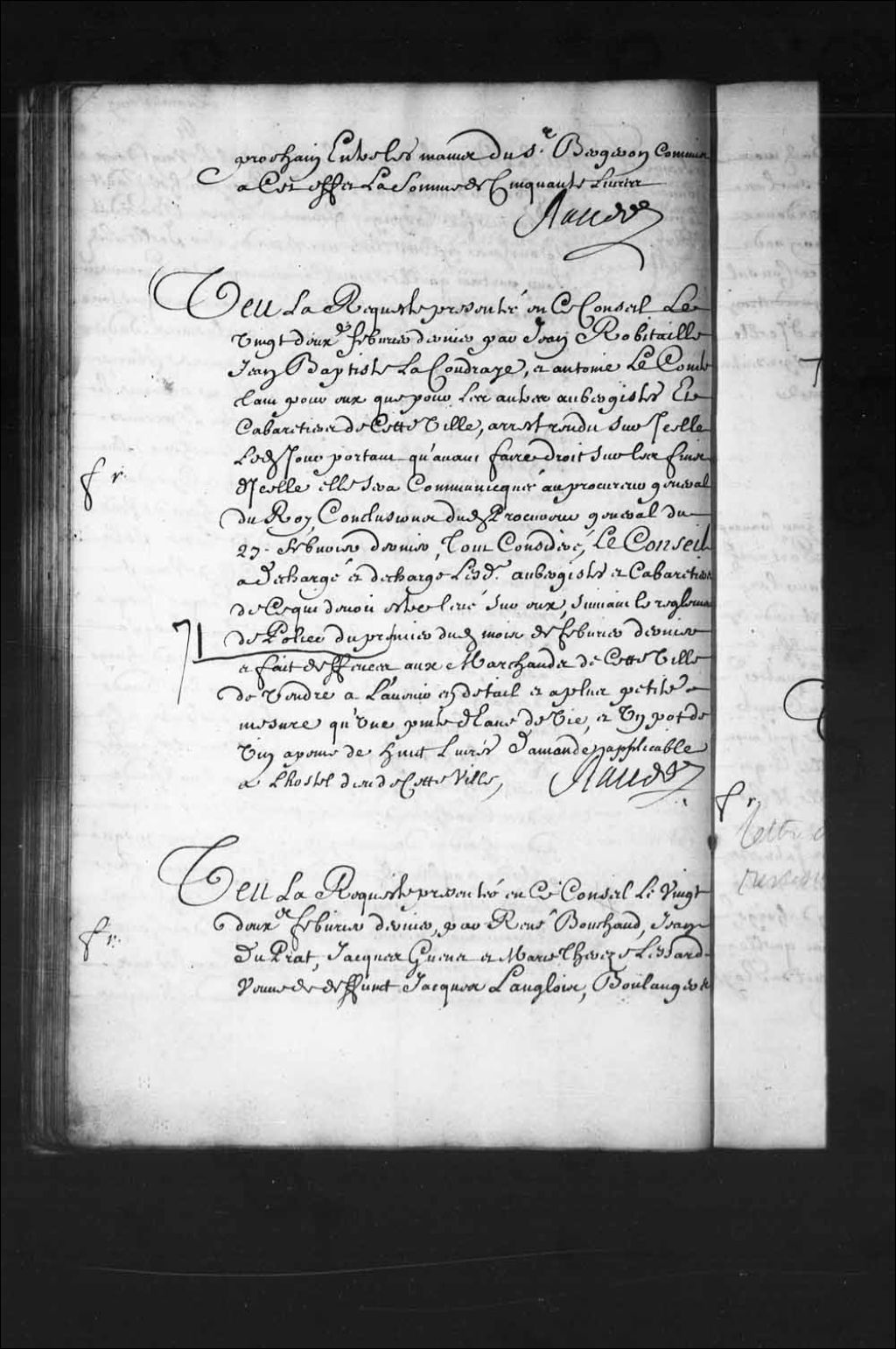 Transcription du texte avec orthographe modernisée : «Vu la requête présentée en ce Conseil le vingt-deuxième février dernier, par René Bouchaud (Boucheau) , Jean Duprat, Jacques Guenet et Marie Thérèse Lessard veuve de défunt Jacques Langlois, boulangers en cette ville, arrêt rendu sur icelle ledit jour portant qu'elle serait communiquée au procureur général du Roi, conclusions dudit procureur général du vingt-septième dudit mois de février tout considéré, le Conseil a ordonné et ordonne qu'à l'avenir le petit pain de vingt deniers pèsera seulement douze onces, que le pain blanc sera vendu vingt deniers la livre et le pain bis blanc, quinze deniers la livre, et qu'au surplus le règlement fait le premier jour dudit mois de février dernier en ce qui regarde lesdits boulangers sera exécuté selon sa forme et teneur, ordonne en outre que Louis Prat aussi boulanger en cette ville, sera tenu de faire sa déclaration dans huitaine s'il veut [...]