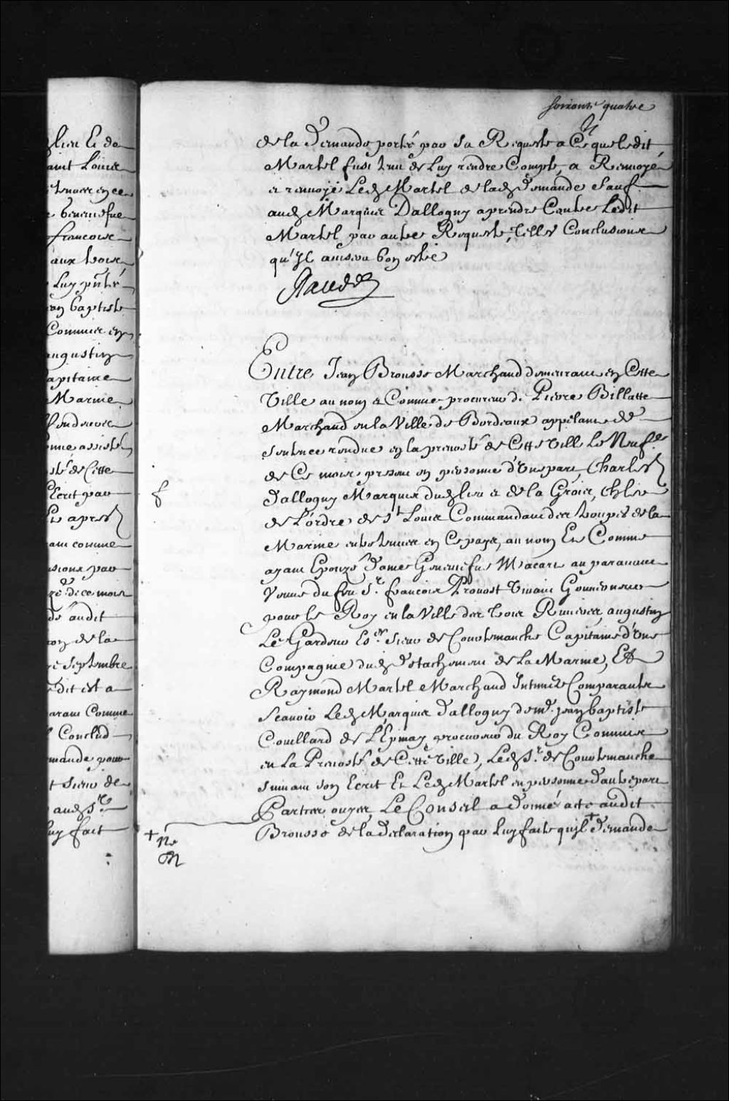 Transcription du texte avec orthographe modernisée : «Entre Jean Brousso (Brousseau) marchand demeurant en cette ville au nom et comme procureur de Pierre Billatte marchand en la ville de Bordeaux appelant de sentence rendue en la prévôté de cette ville le neuvième de ce mois présent en personne d'une part, Charles DALLOGNY (D'Aloigny) marquis dudit lieu et de Lagrois (Lagroix) , chevalier de l'ordre de Saint-Louis commandant des troupes de la marine entretenues en ce pays au nom et comme ayant épousé dame Geneviève Macart (Macard) auparavant veuve du feu sieur François Provost vivant gouverneur pour le Roi en la ville des Trois-Rivières, Augustin LEGARDEUR écuyer sieur de COURTEMANCHE capitaine d'une compagnie dudit détachement de la marine, et Raymond MARTEL marchand intimés comparants savoir ledit marquis Dallogny de maître Jean-Baptiste Couillard de Lepinay procureur du Roi commis en la prévôté de cette ville, ledit sieur de [...]