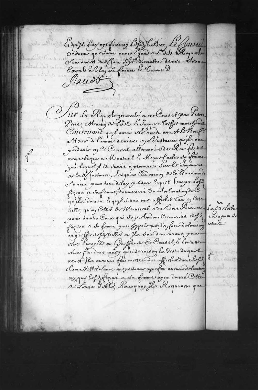 Transcription du texte avec orthographe modernisée : «Sur la requête présentée en ce Conseil par Pierre Perre, Martin Délisle et Jacques Trehet marchands contenant, qu'il aurait été rendu arrêt le neuvième mars de l'année dernière en l'instance qu'ils ont pendante en ce Conseil à l'encontre de René Fezeret arquebusier à Montréal et Marie Carlier sa femme par lequel il est sursis à prononcer sur les jugements de ladite instance, jusqu'au lendemain de la Quasimodo suivant pour tout délai pendant lequel temps lesdits Fezeret et sa femme, donneraient une déclaration de ce qu'ils doivent et qu'il serait mis affiches tant en cette ville, qu'en celles de Montréal et des Trois-Rivières pour avertir ceux qui se prétendent créanciers desdits Fezeret et sa femme par hypothèques, d'en faire déclaration au greffe desdites villes ou Ils sont demeurant pour être envoyés au greffe de ce Conseil, et ensuite être fait droit ainsi que de raison, en vertu [...]