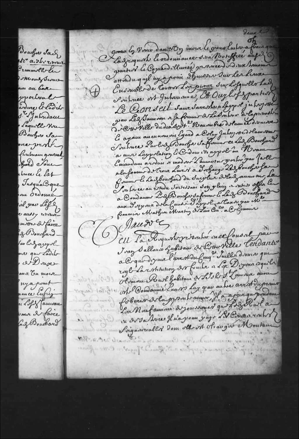 - Transcription du texte avec orthographe modernisée : «Vu la requête présentée en ce Conseil par Jean Sallouer (Salois) habitant de cette ville tendante à ce que depuis l'arrêt du cinquième juillet dernier qui règle la restitution des fruits et les dépens desquels Clément Ruel habitant de l'île Saint-Laurent avait été condamné envers lui par autre arrêt du premier février de la présente année, il a appris que pendant les neuf années de jouissances que ledit Ruel a eu de sa terre il n'a point payé les cens et rentes seigneuriales dont elle est chargée montant à trente sols quelques deniers par an quoi qu'il y fût naturellement obligé requérant qu'il plût au Conseil condamner ledit Ruel à payer les arrérages desdits cens et rentes depuis le jour de son acquisition jusqu'à présent et en fournir incessamment quittance et décharge valable et le condamner aux dépens, arrêt rendu sur ladite requête le neuvième du présent mois portant qu'elle [...]